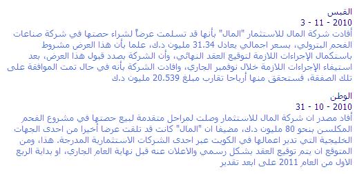 الأخبار المنشورة في الصحف اليومية عن شركة المال لشهري أكتوبر ونوفمبر 2010