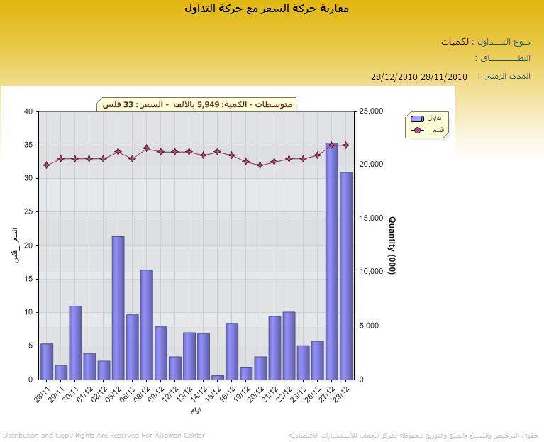 مقارنة حركة السعر مع حركة التداول بناء على الكميات لسهم أبيار للفترة المقارنة من 28/11/2010 حتى 28/12/2010