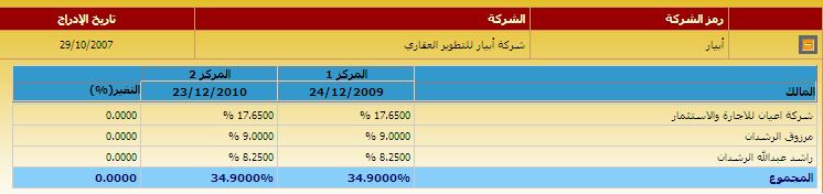 مقارنة الملكيات المعلنة لسهم أبيار للفترة المقارنة من 24/12/2009 حتى 23/12/2010