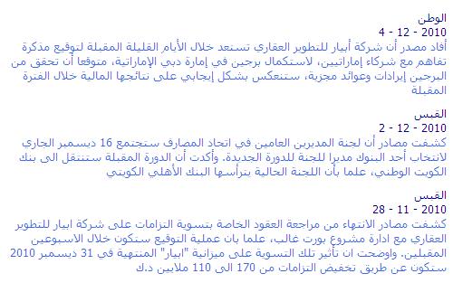 الأخبار المنشورة في الصحف اليومية لشركة أبيار للتطوير العقاري لشهري نوفمبر وديسمبر 2010