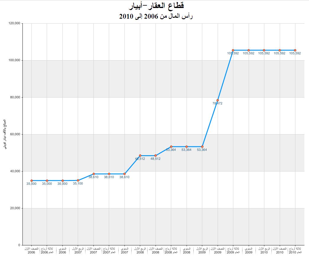 رأس المال شركة أبيار للتطوير العقاري للفترة المقارنة من الربع الأول 2006 حتى ثلاثة أرباع العام 2010
