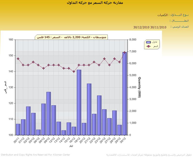 مقارنة حركة السعر مع حركة التداول بناء على الكميات لسهم منا القابضة للفترة المقارنة من 30/11/2010 حتى 30/12/2010