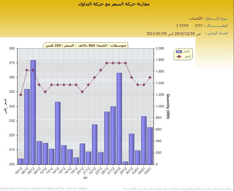 مقارنة حركة السعر مع حركة التداول لسهم تمدين أ بناء على الكميات للفترة المقارنة 5/12/2010 حتى 5/1/2011