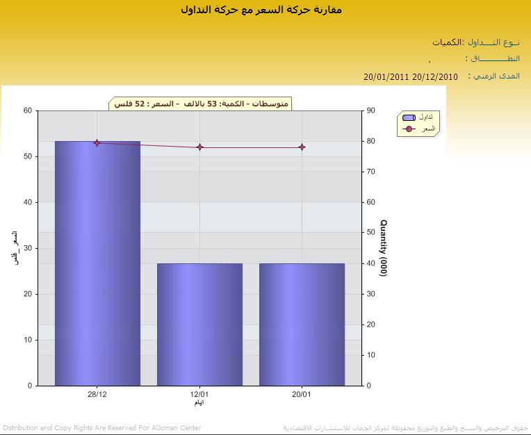 مقارنة حركة السعر مع حركة التداول بناء على الكميات لسهم وطنية د.ق للفترة المقارنة من 20/12/2010 حتى 20/1/2011