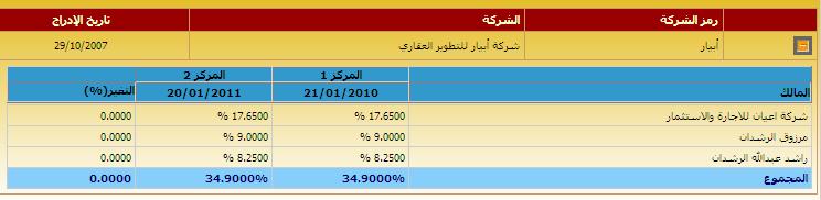 مقارنة الملكيات المعلنة لسهم أبيار للتطوير العقاري للفترة المقارنة من 21/1/2010 حتى 20/1/2011