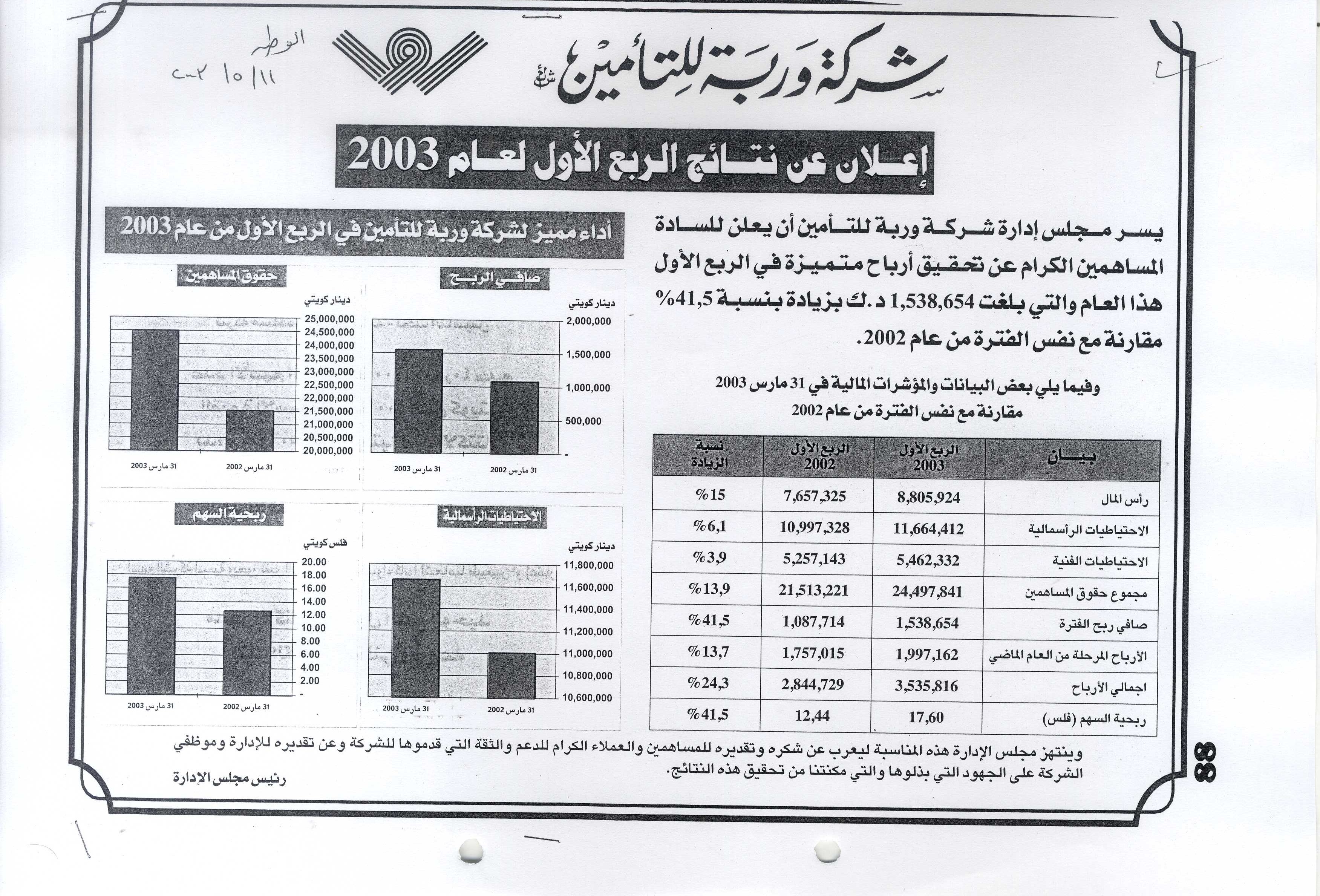 "وربة" إعلان تذكيري السادة المساهمين الكرام بموعد انعقاد الجمعية العمومية العادية وغير العادية المقرر عقدها يوم 2003/3/31 |