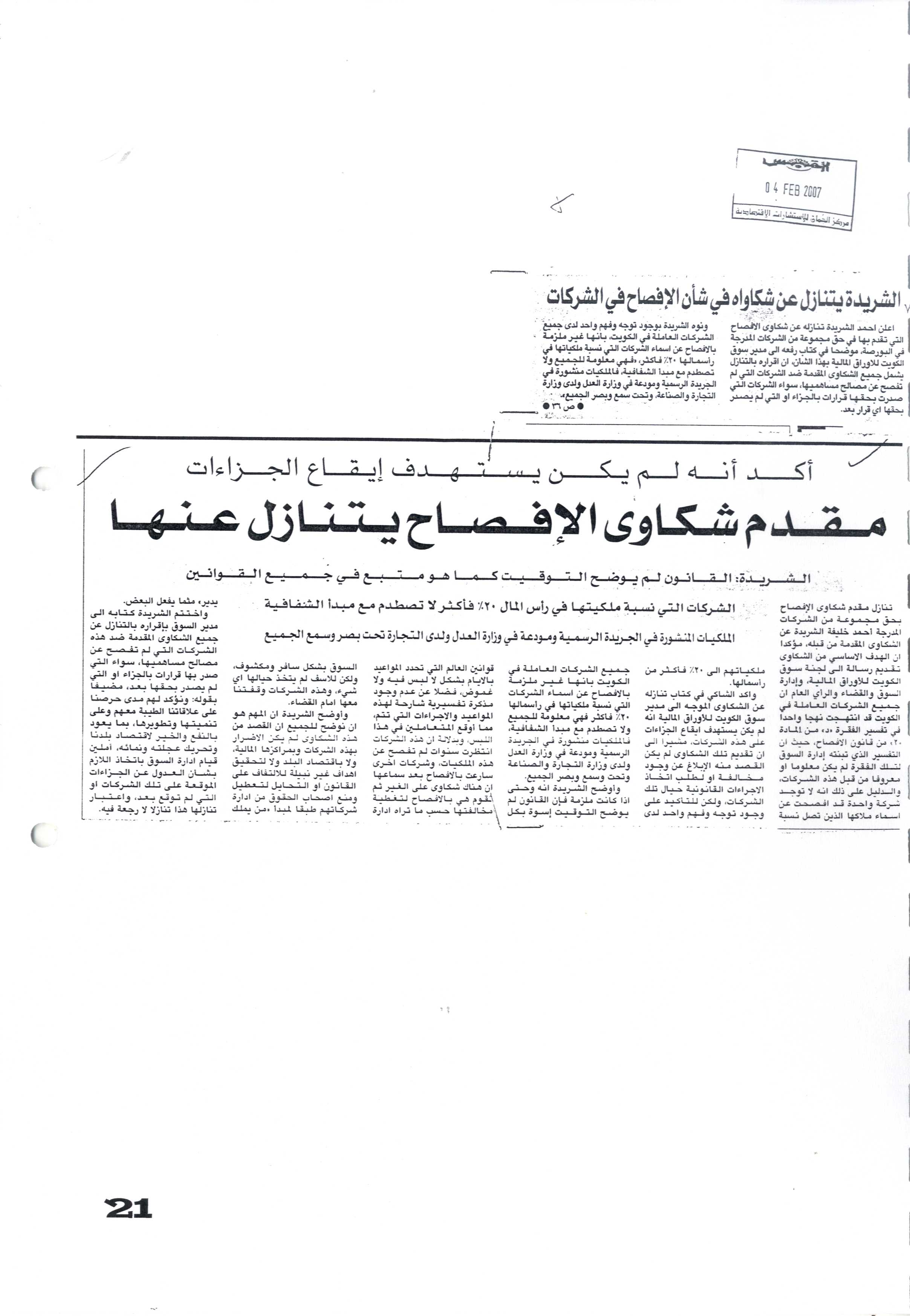 الشريدة يتنازل عن شكاوى الإفصاح عن الشركات المدرجة ومنها "المصالـــح ع"
