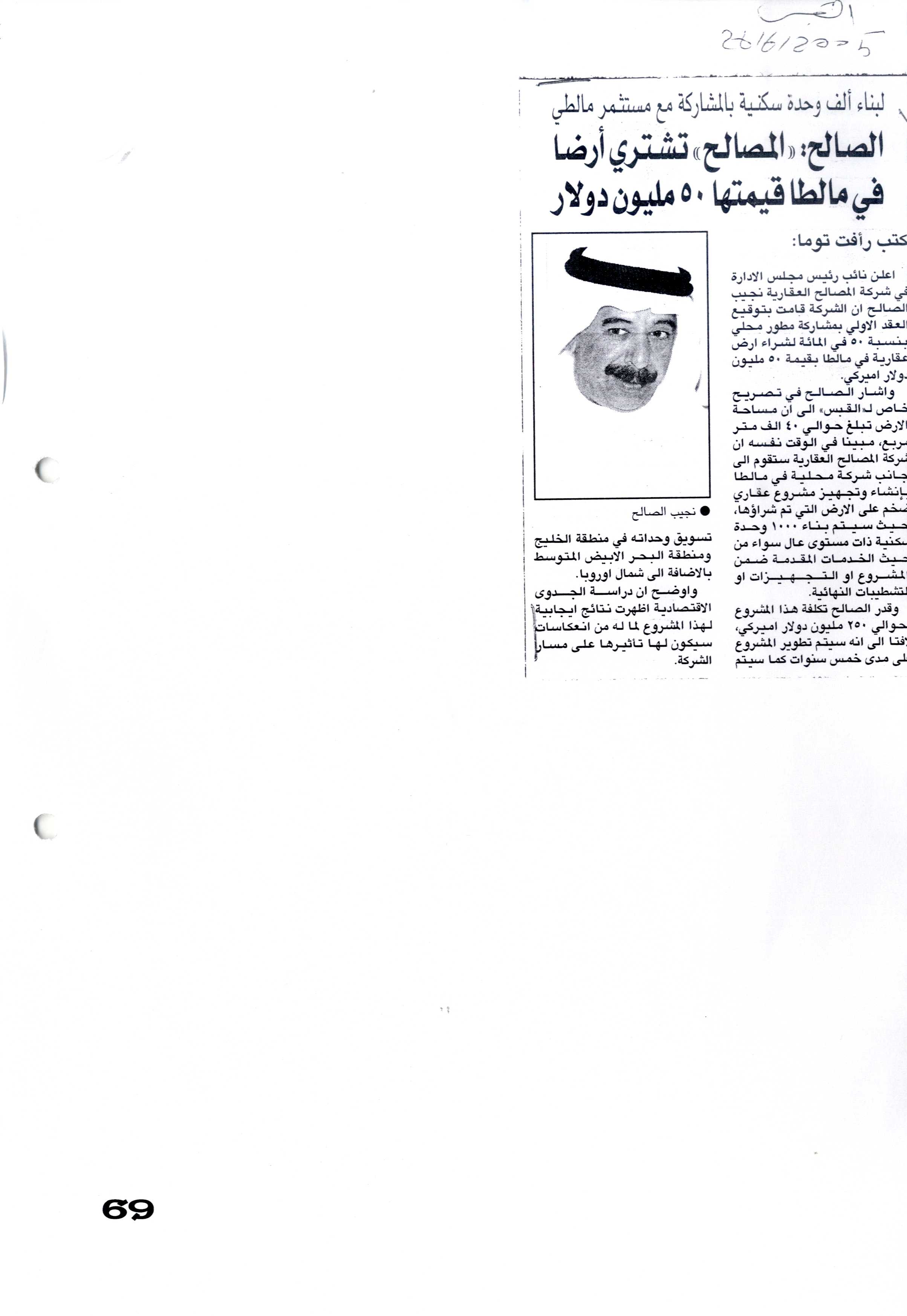 الصالح : 10 ملايين دينار أرباحاً متوقعة لـ "المصالـــح ع" من بيع مشروع دبي