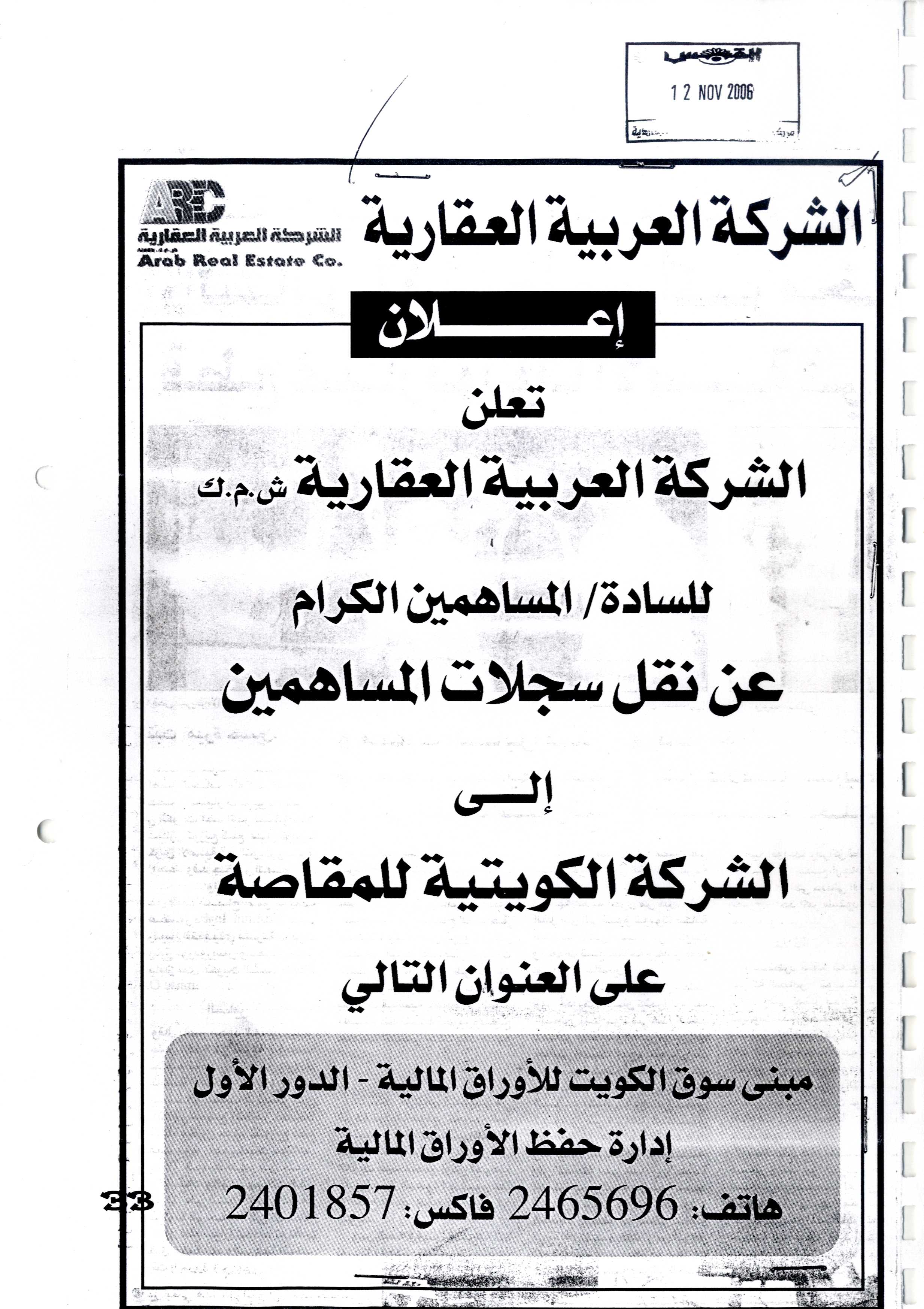 تعلن "ع عقارية" للسادة / لمساهمين الكبار عن نقل سجلات المساهمين إلى الشركة الكويتية للمقاصة
