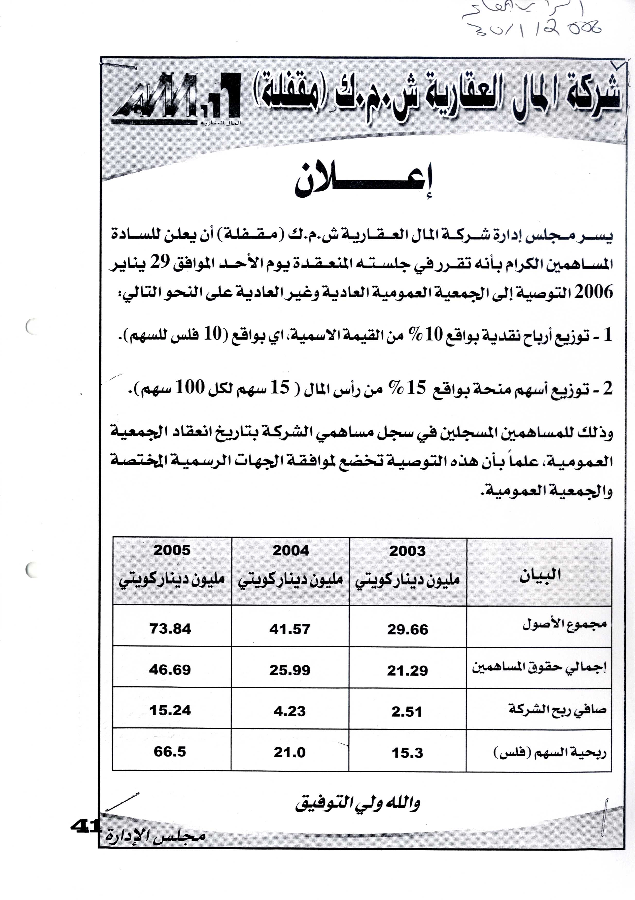 إعلان بأنه تقرر في الجلسة المنعقدة يوم الأربعاء الموافق 17 يناير 2007 التوصية إلى الجمعية العمومية العادية وغير العادية بـ : توزيع أرباح نقدية بواقع 15% ، توزيع أسهم منحة بواقع 10% من رأس المال