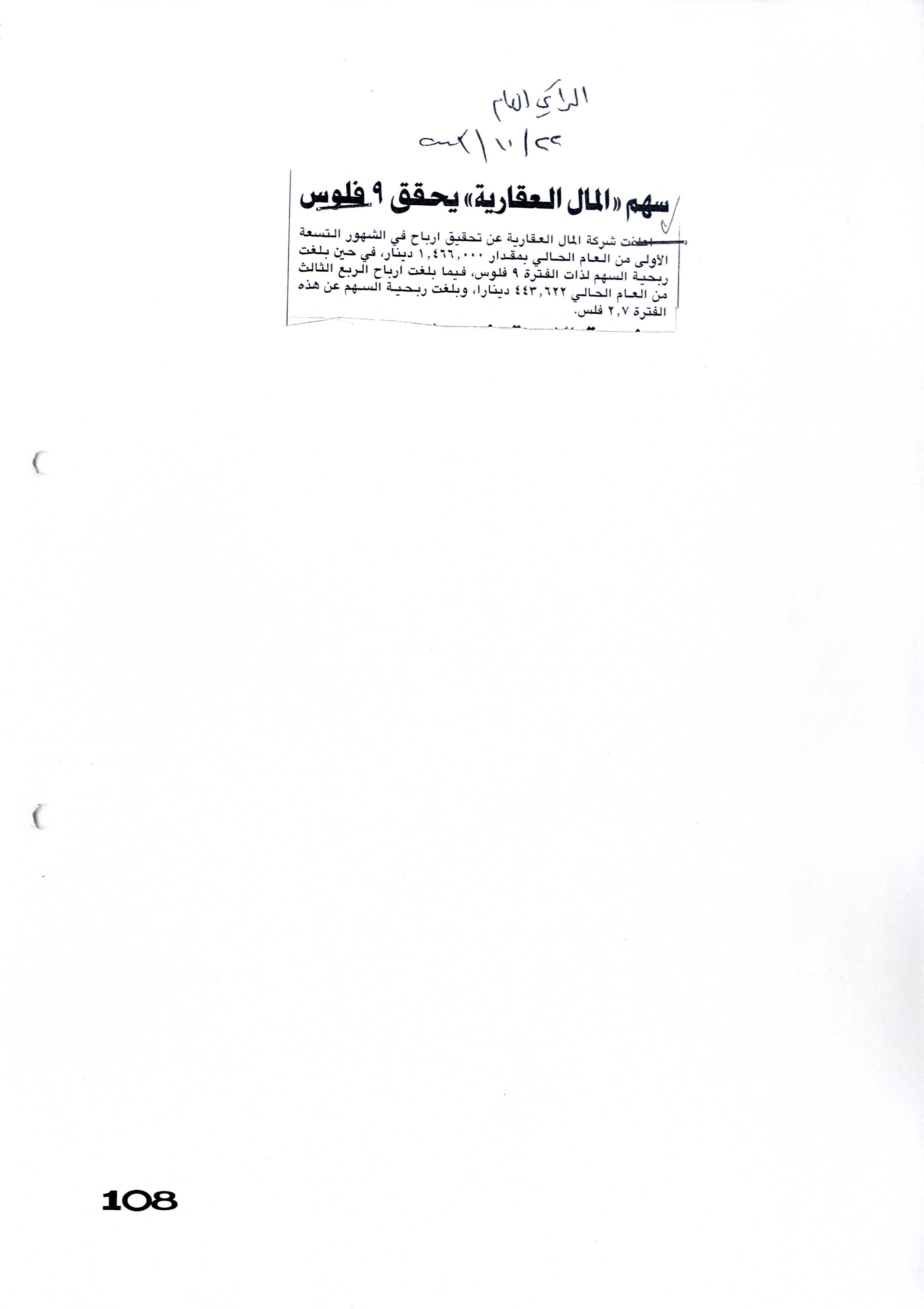 "المال العقارية" تحقق 1.7 مليون دينار وتقرر توزيع 8 في المئة منحـــــــة
