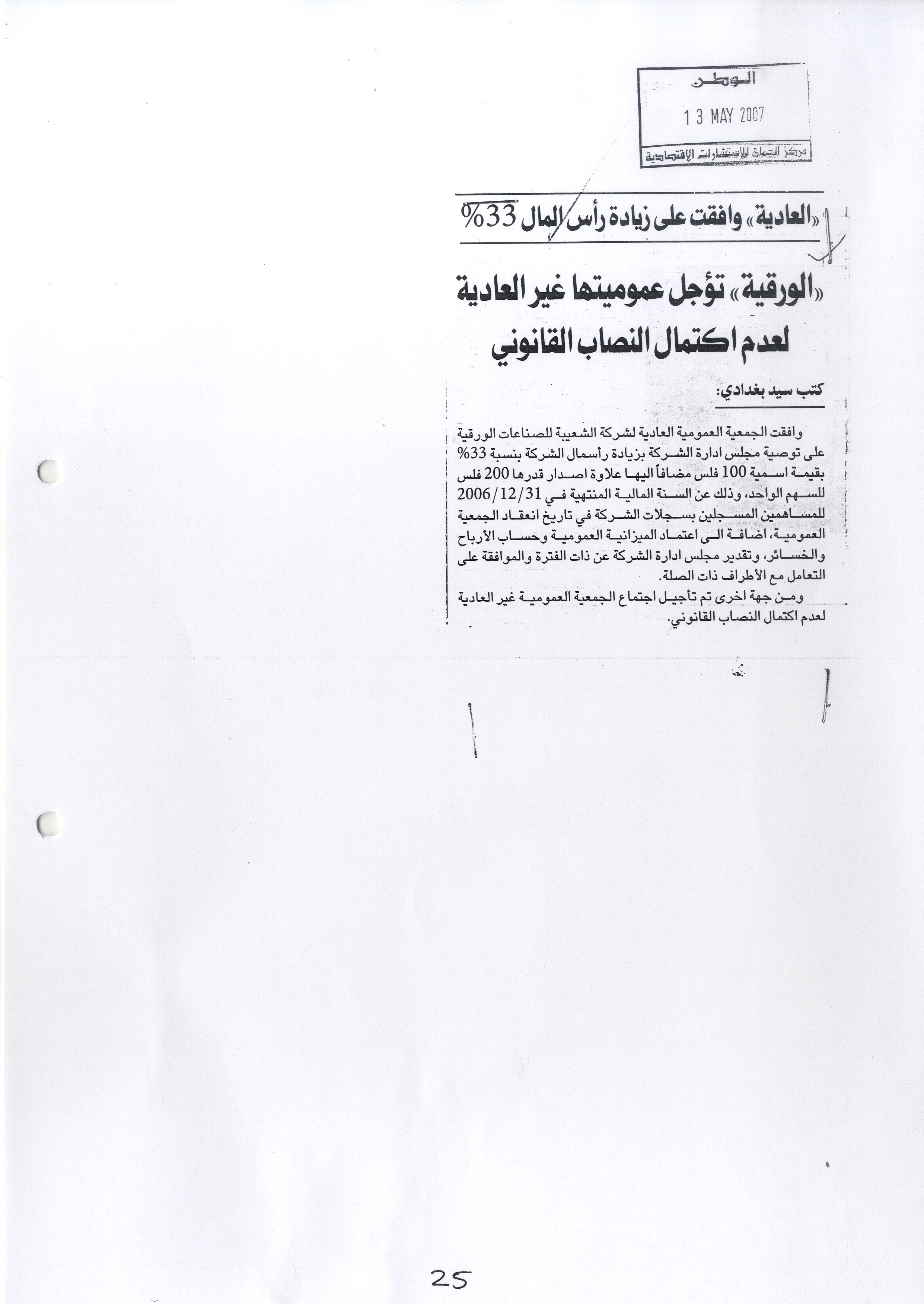 "ورقية" : دعوة لحضور اجتماع جمعية عمومية الغير عادية (المؤجلة) للسنة المالية 2006