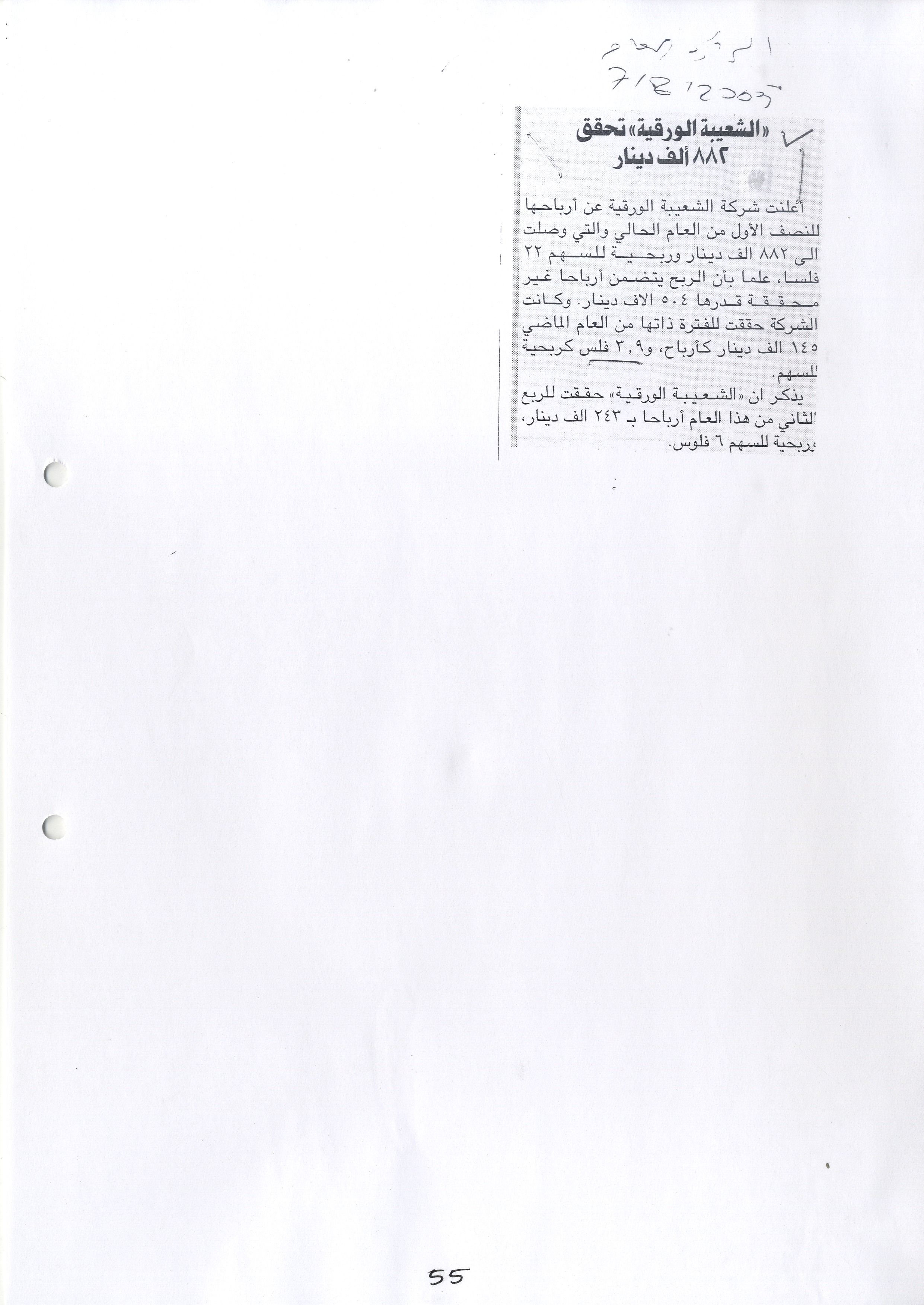"ورقية" تحقق 2.84 فلسأ أرباحاً في الربع الأول من عام 2002