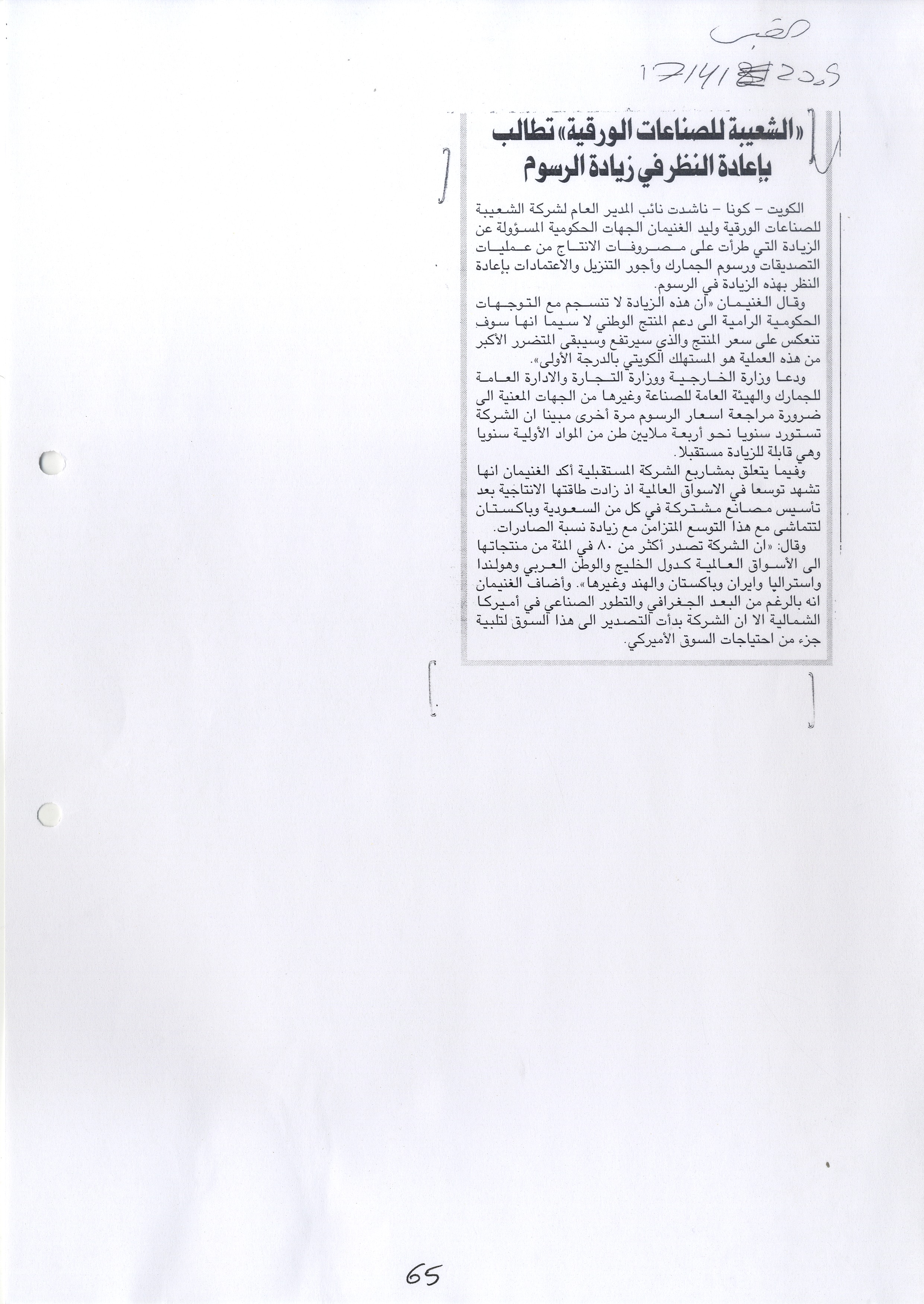 تعلن "غلف انفست" أن حصة ربحها المتوقع من بيع 44% من رأس مال "ورقية" هو 1.5 مليون دينار