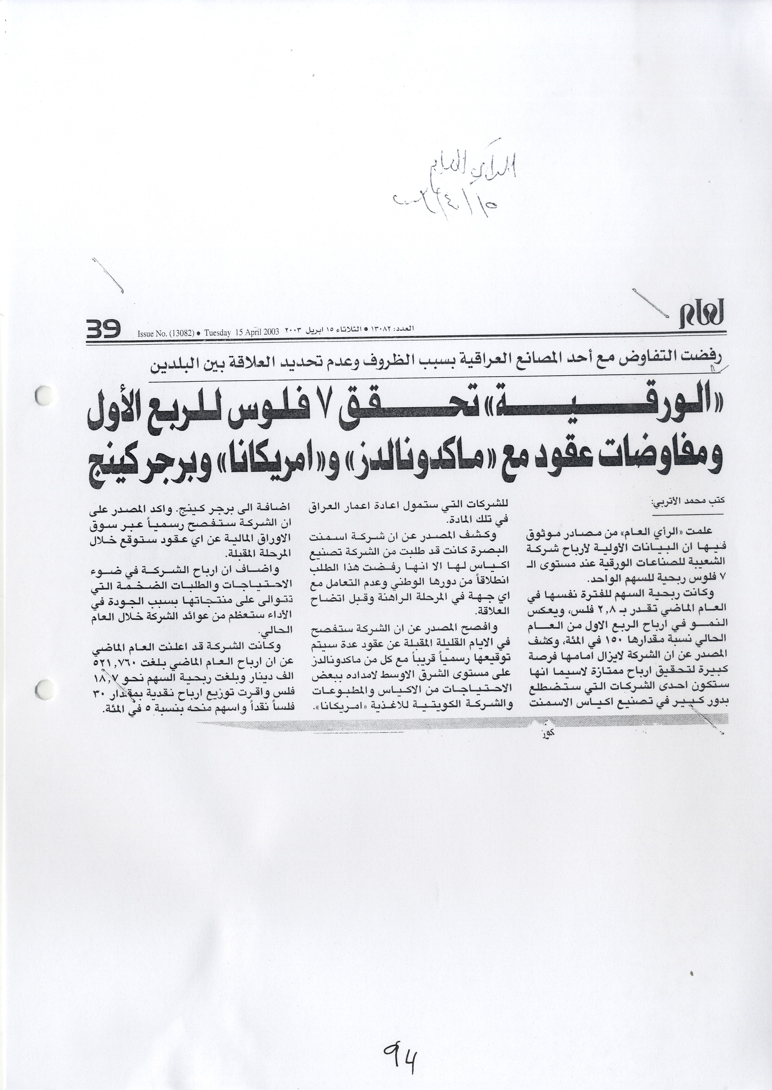 7.5 فلس ربحية سهم "ورقية" في الربع الاول لعام 2003