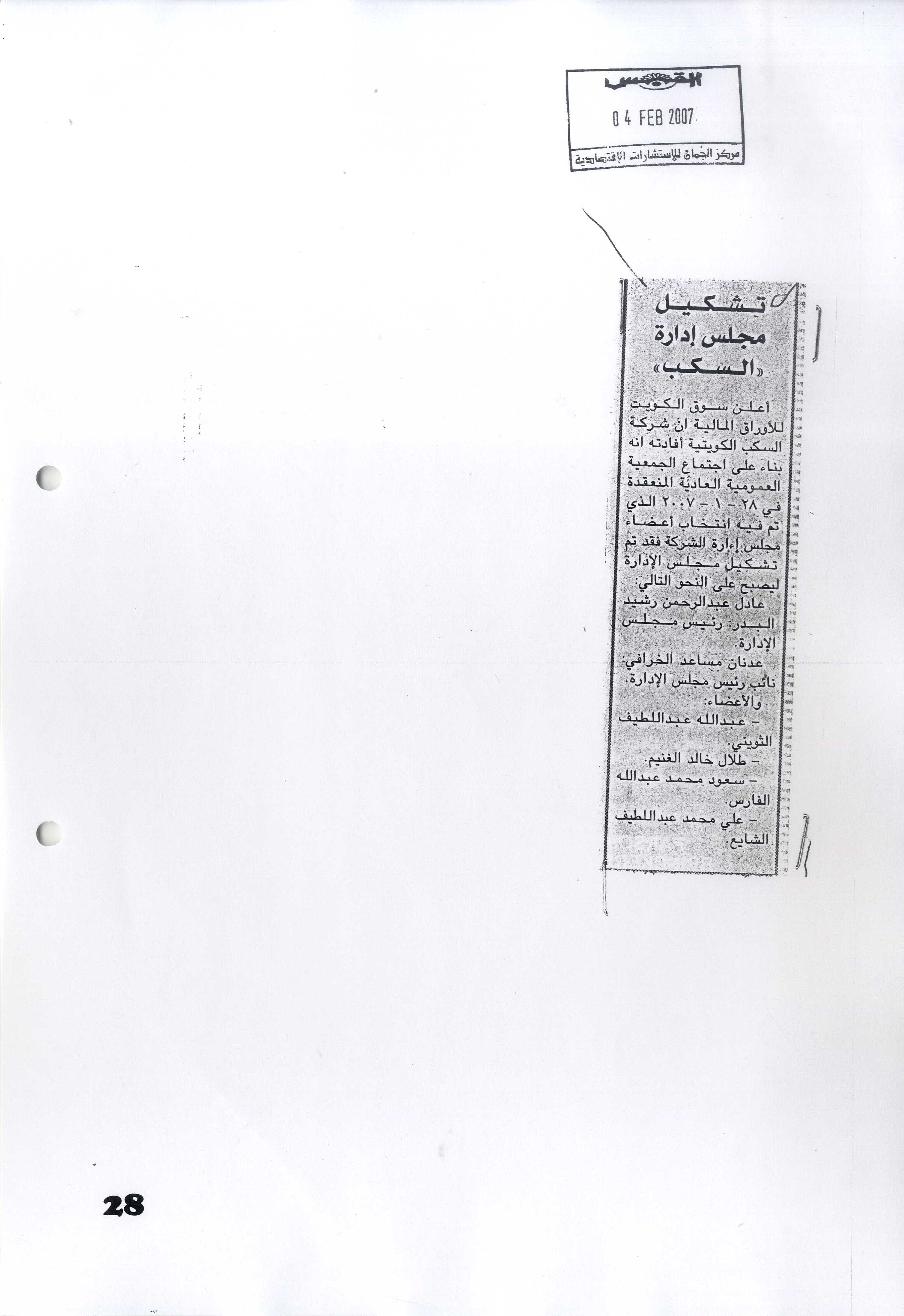 "سكب ك": دعوة لحضور اجتماع الجمعية العمومية العادية والغير عادية للسنة المالية المنتهية في 2006/12/31 المقرر عقدها يوم 2007/4/7 |