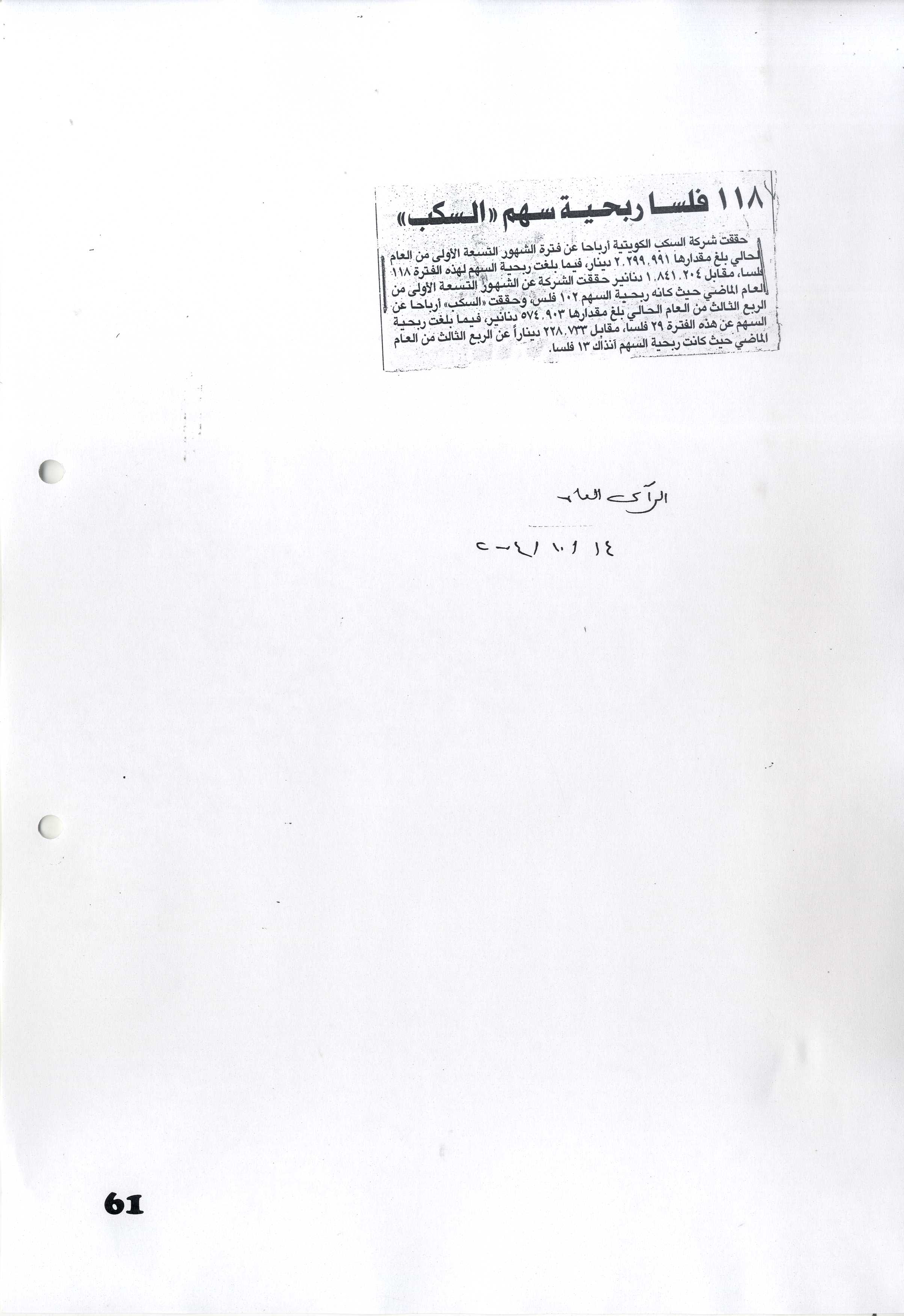 ربحية "سكب ك" 123 فلساً للسهم 1.8 مليون دينار أرباح الأشهر التسعة |