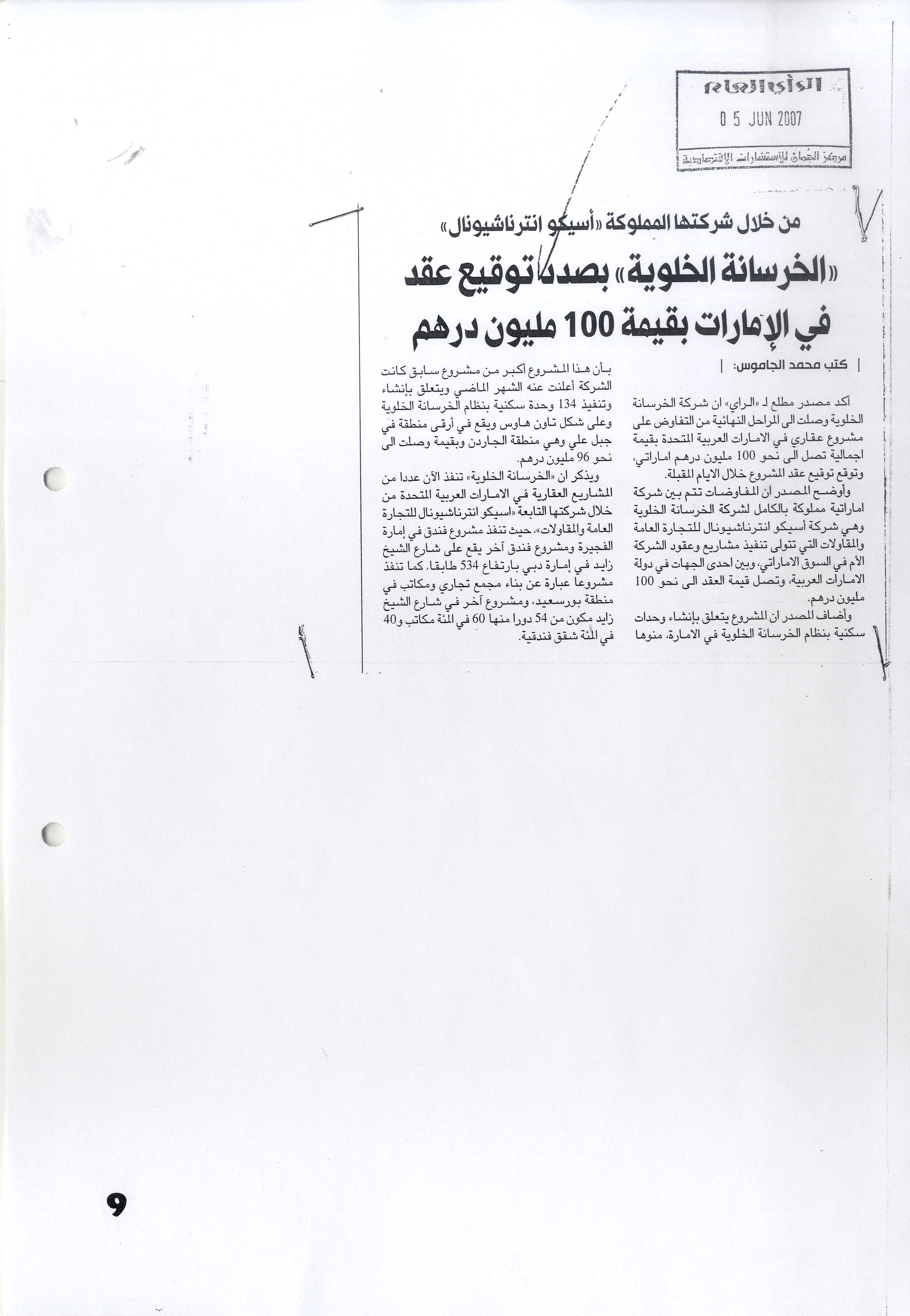 | 9 | الراي | 2007.06.05 | "خرسانة خ" بصدد توقيع عقد في الإمارات بقيمة 100 مليون درهم |
