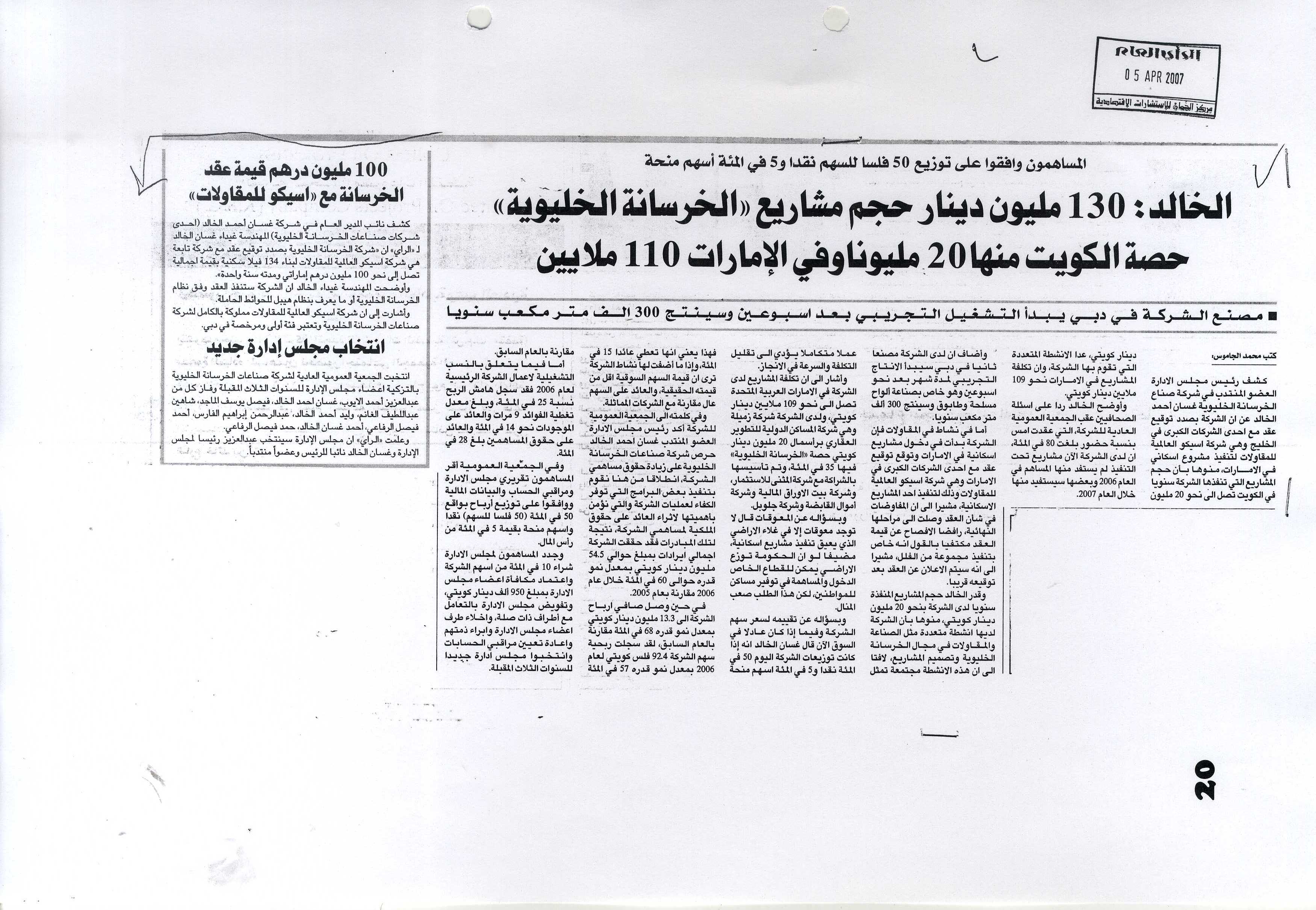 | 20 | الراي | 2007.04.05 | الخالد: 130 مليون دينار حجم مشاريع "خرسانة خ" حصة الكويت منها 20 مليونا وفي الإمارات 110 ملايين |