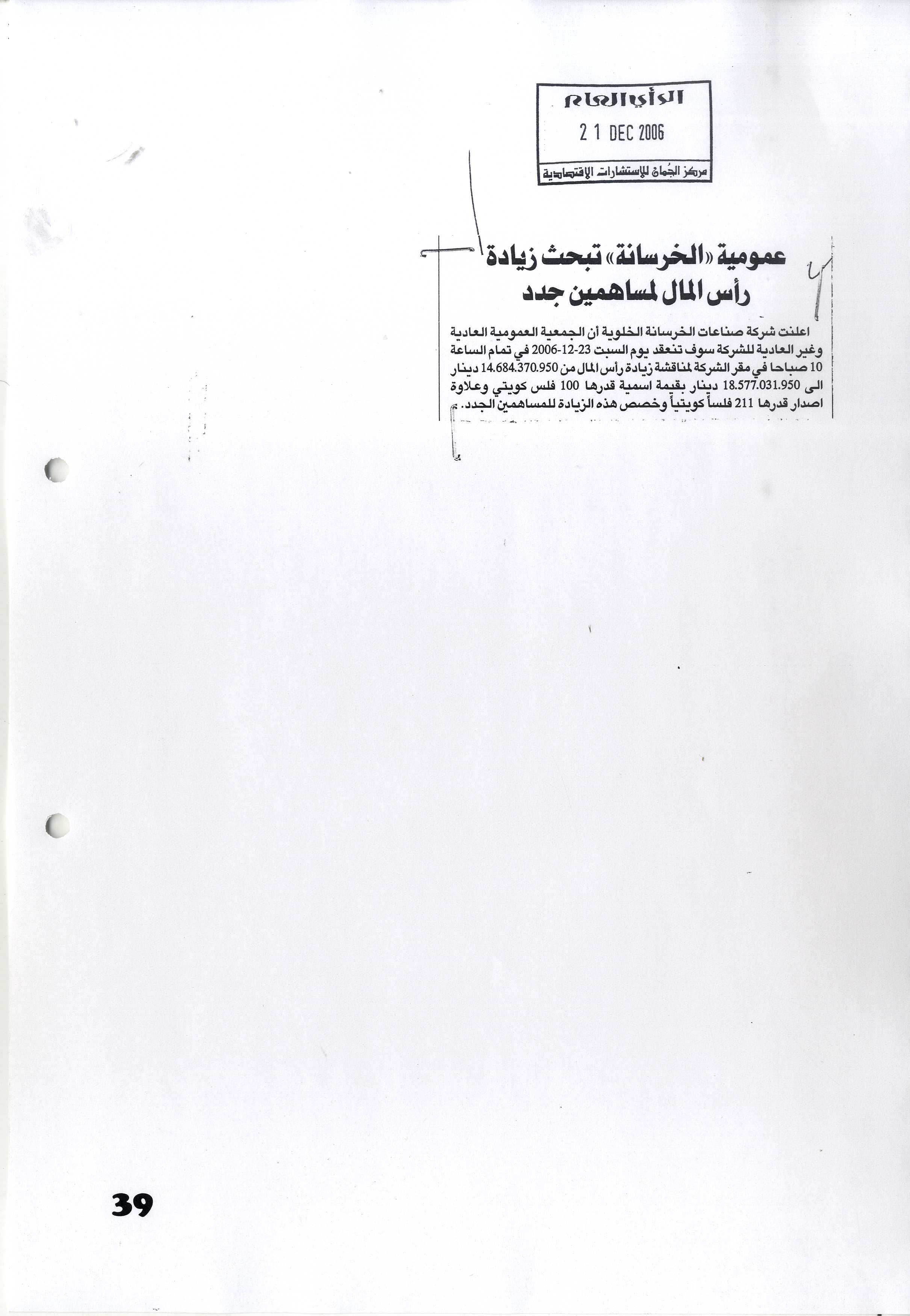 | 39 | الراي | 2006.12.21 | عمومية "خرسانة خ" تبحث زيادة رأس المال لمساهمين جدد |