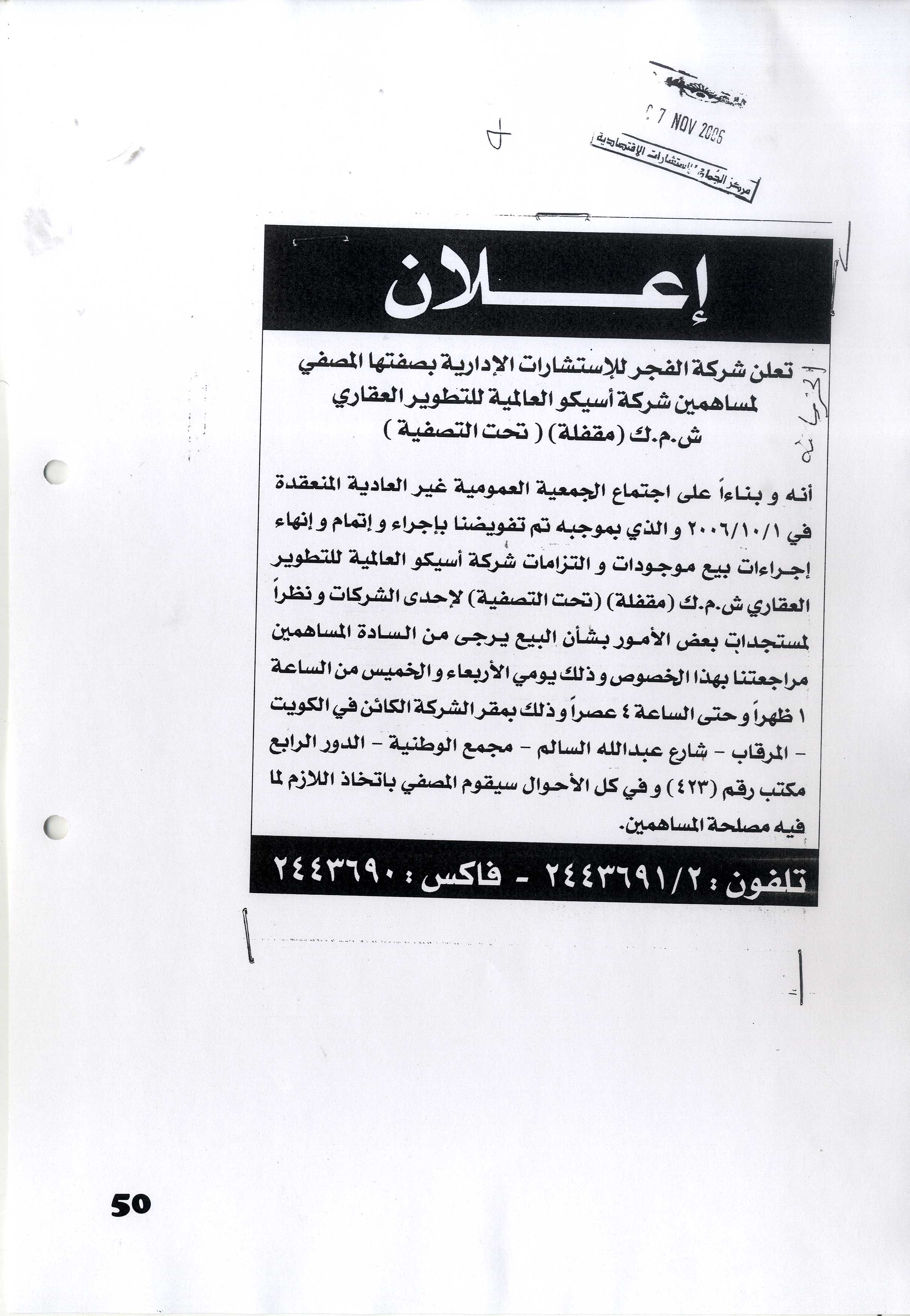 | 50 | القبس | 2006.11.07 | إعلان من شركة الفجر الاستشارية بصفتها المصفى لشركة أسيكو العالمية للتطوير العقاري |