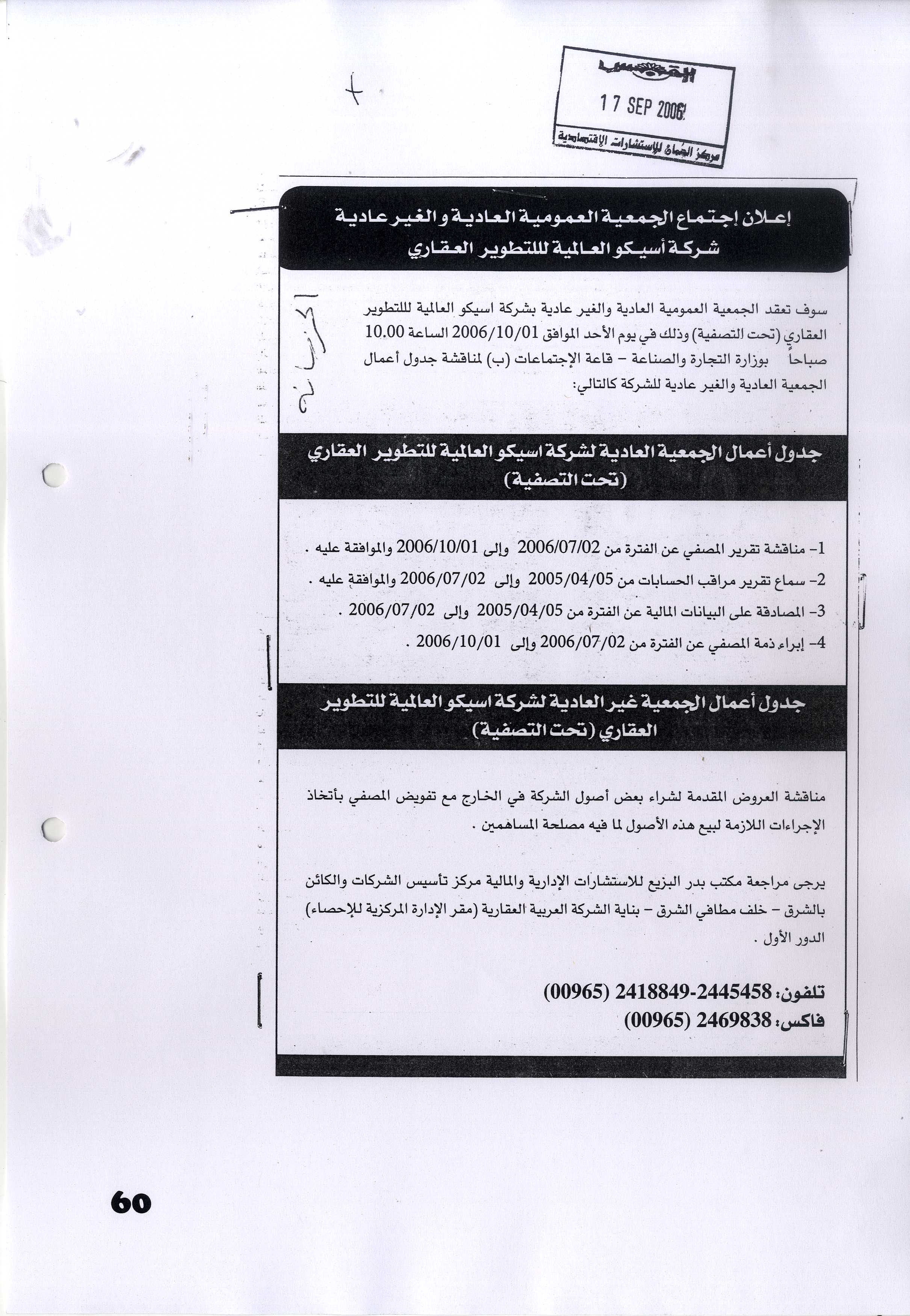 | 60 | القبس | 2006.09.17 | إعلان اجتماع الجمعية العمومية العادية والغير العادية لشركة أسيكو العالمية للتطوير العقاري |