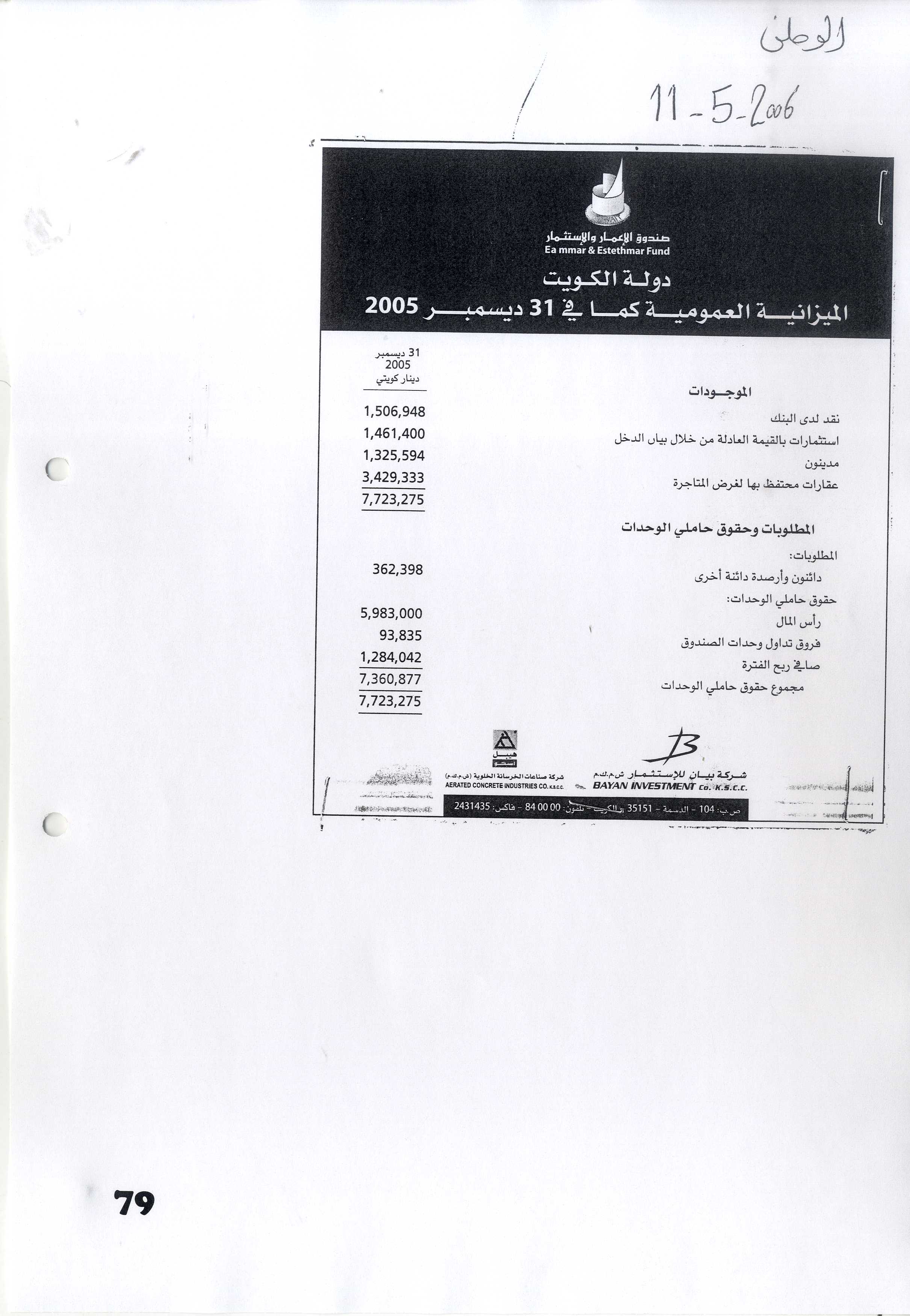 | 79 | الوطن | 2006.05.11 | صندوق الإعمار والاستثمار بإدارة "خرسانة خ": الميزانية العمومية كما في 31/12/2005 |