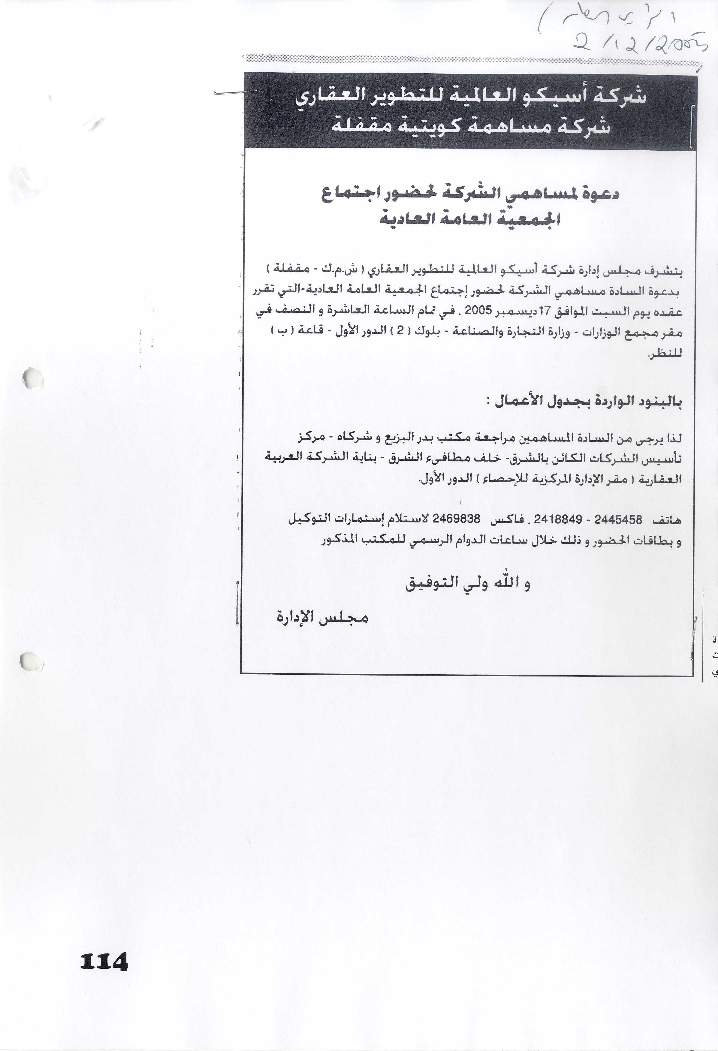 | 155 | القبس | 2005.04.06 | شركة أسيكو العالمية للتطوير العقاري: الجمعية العامة التأسيسية |