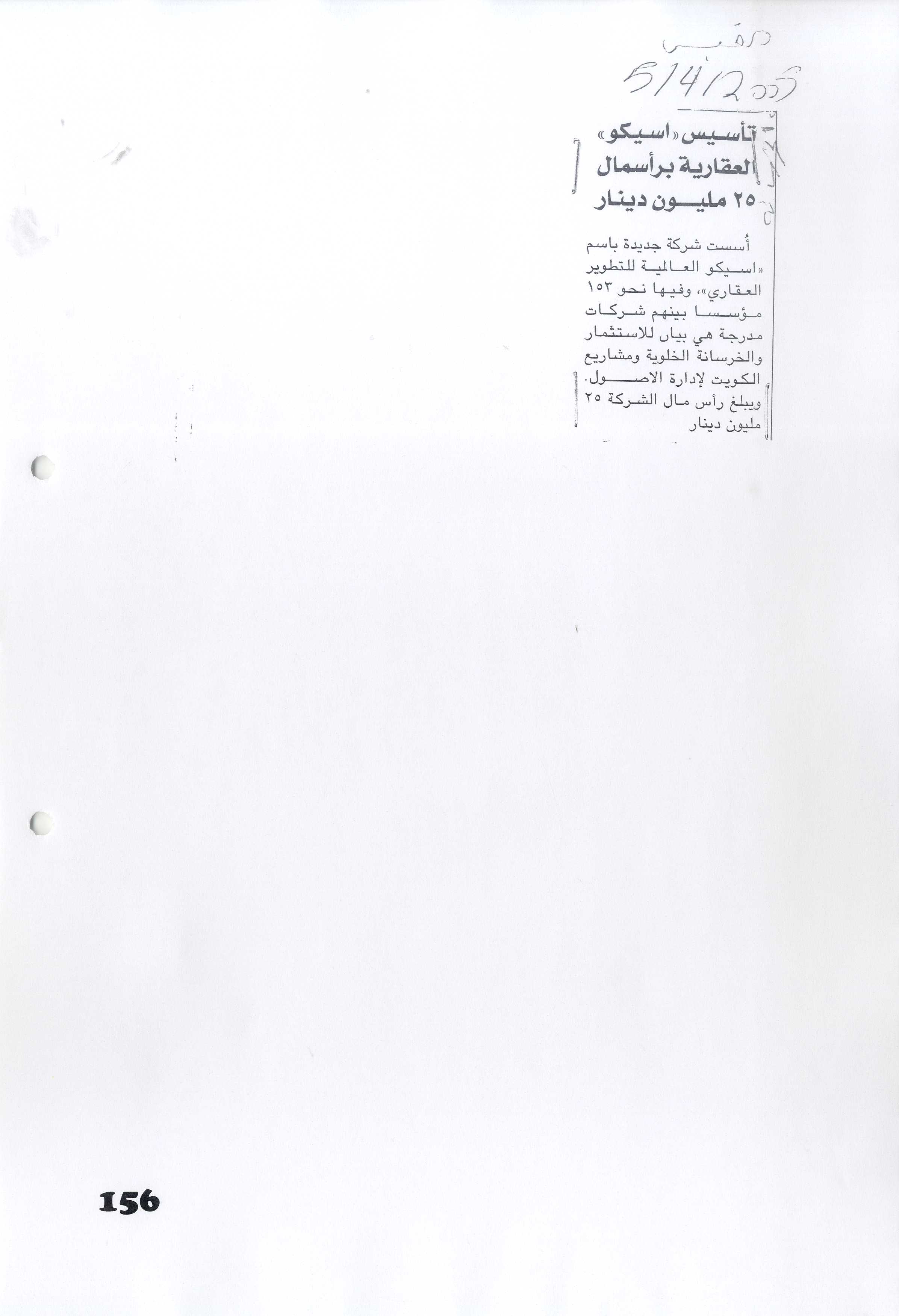 | 156 | القبس | 2005.04.05 | تأسيس "أسيكو" العقارية برأسمال 25 مليون دينار |