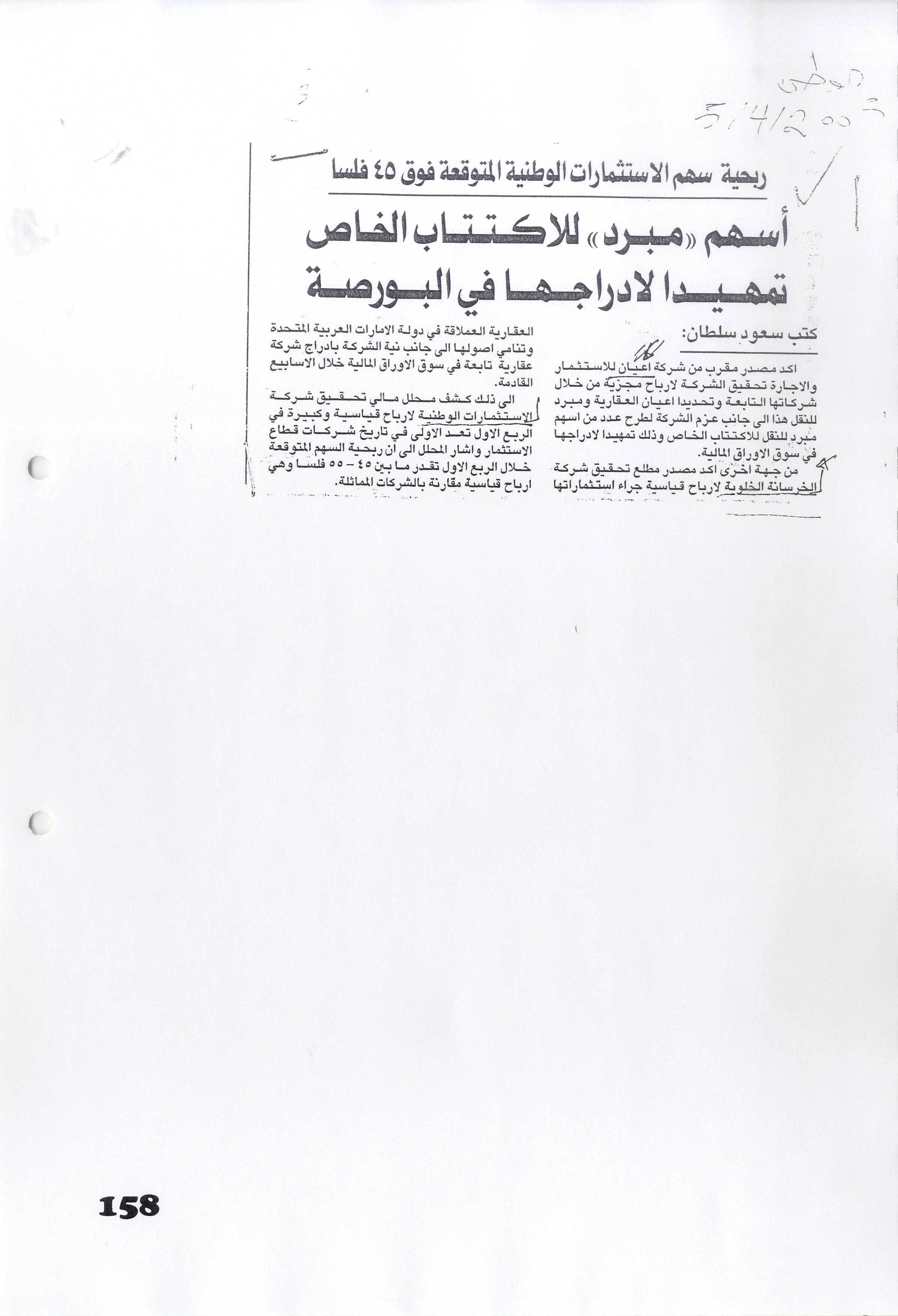 | 158 | الوطن | 2005.04.05 | مصدر مطلع: "خرسانة خ" تحقق أرباحاً قياسية جراء استثماراتها في الإمارات |