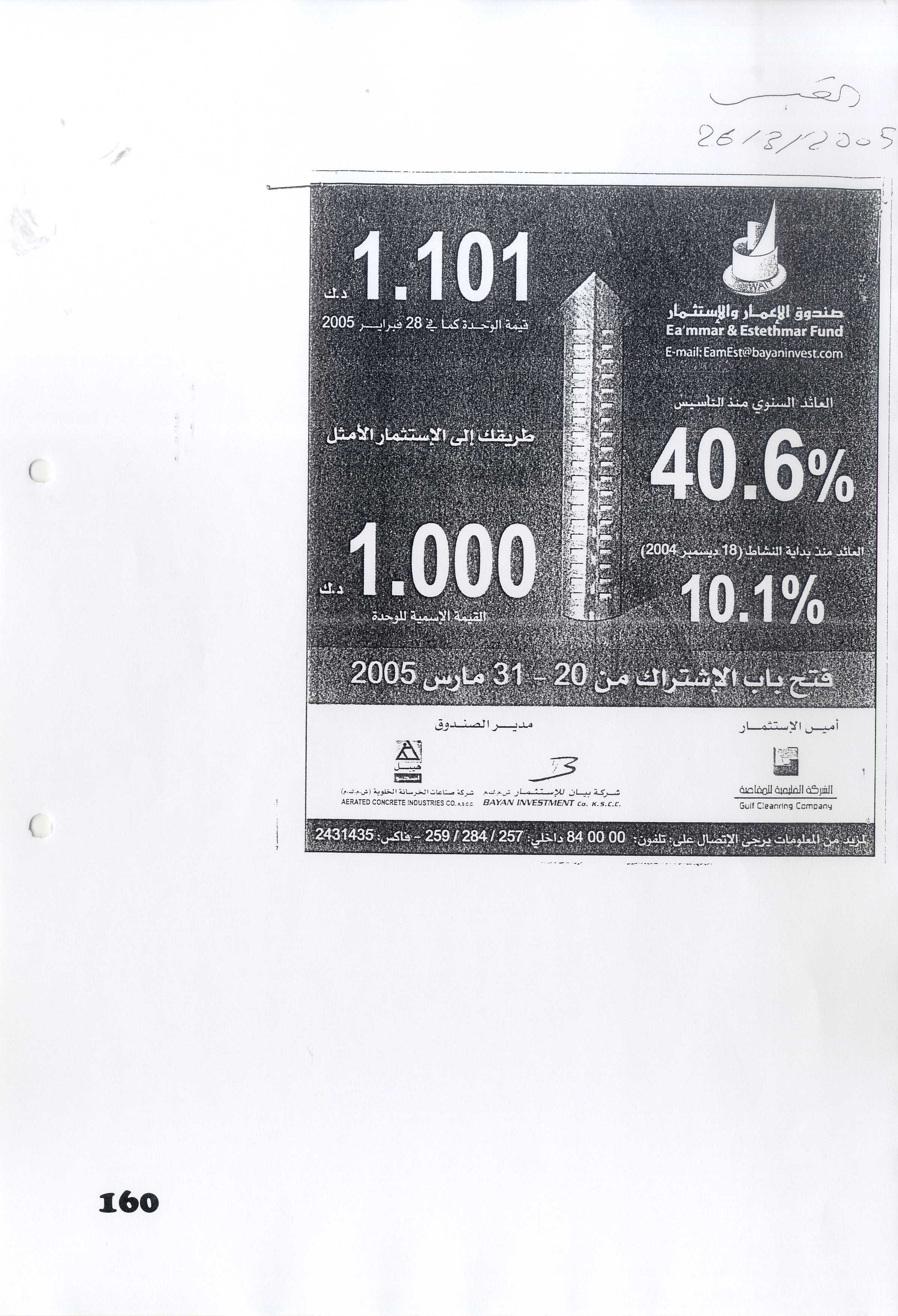 | 160 | القبس | 2005.03.26 | صندوق الإعمار والاستثمار بإدارة "خرسانة خ": طريقك للاستثمار الأمثل |