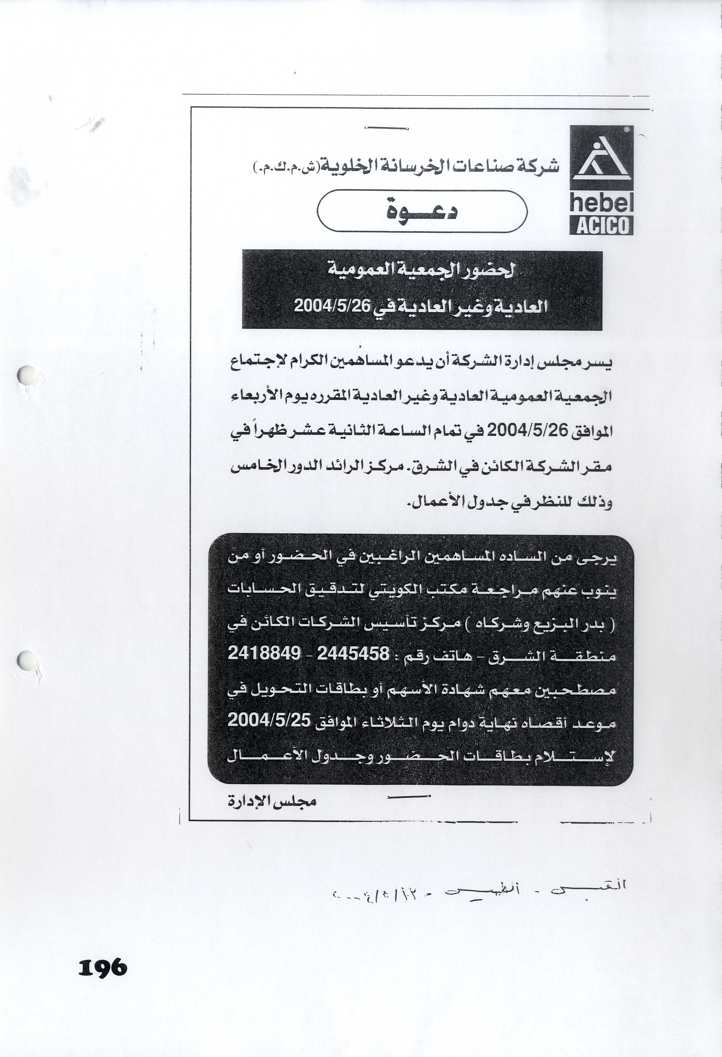 | 196 | القبس | 2004.05.13 | دعوة لحضور الجمعية العمومية العادية وغير العادية في 26/05/2004 |