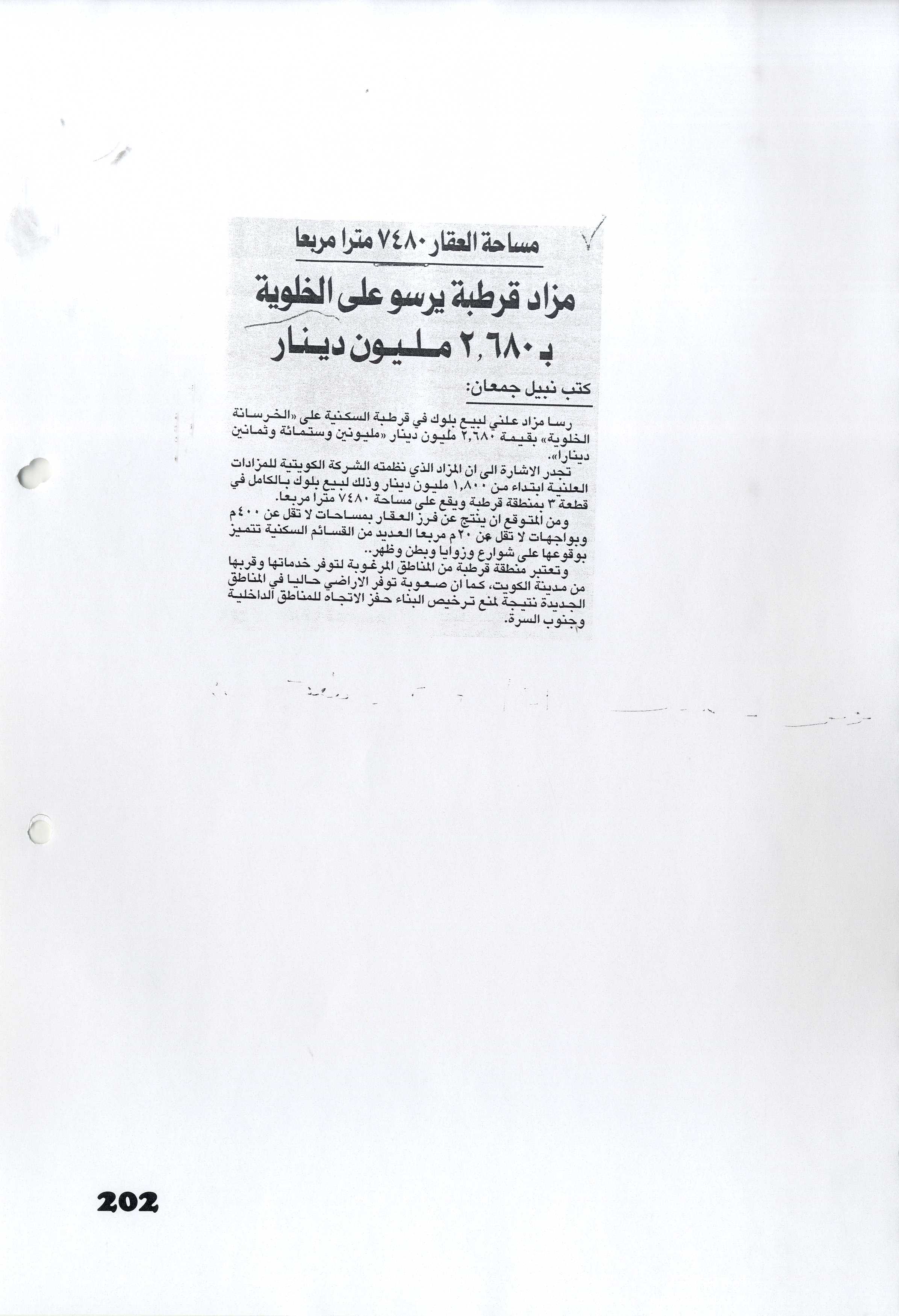| 189 | الراي | 2004.07.08 | تقييم أرض "خرسانة خ" في الإمارات بقيمة 16 مليون دينار |