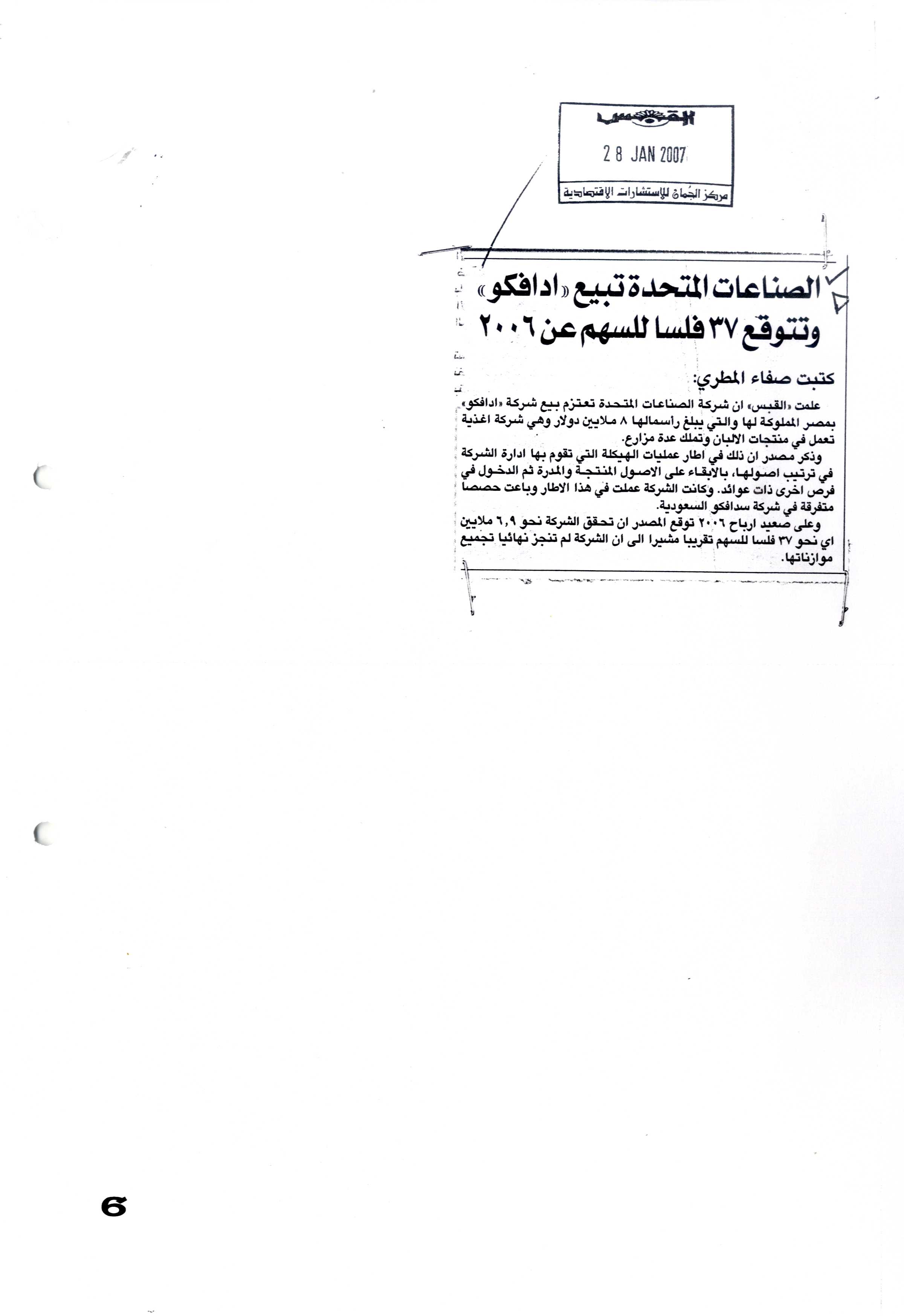 | 6 | القبس | 2007.06.28 | "ص متحدة " تبيع "ادافكو" المملوكة لها في مصر وتتوقع 37 فلسا للسهم عن 2006 |