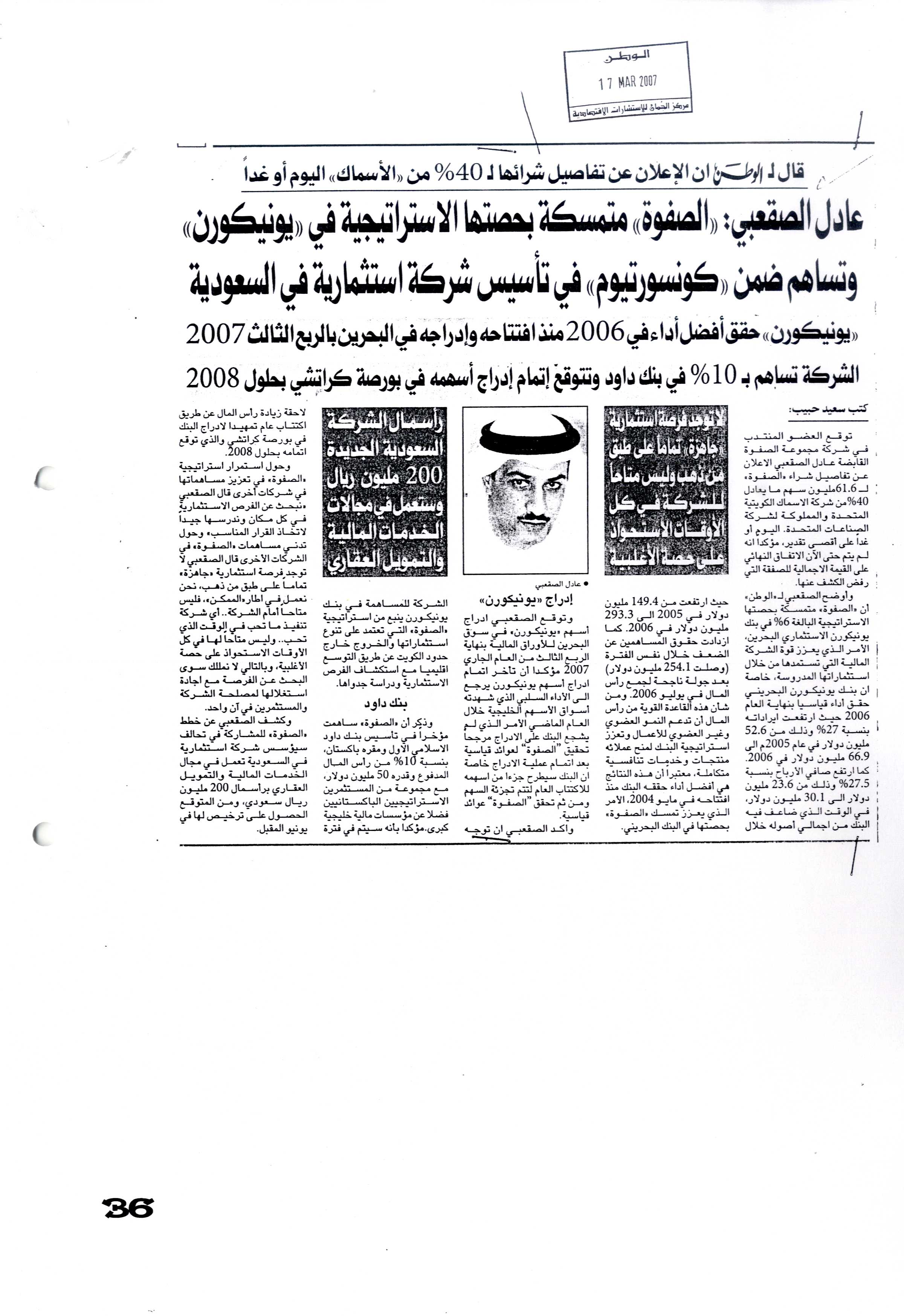 | 36 | الوطن | 2007.03.17 | عادل الصقعبي : "الصفوة" متمسكة بحصتها الاستراتيجية في "يونيكورن" وتساهم ضمن "كونسورتيوم" في تأسيس شركة استثمارية في السعودية |