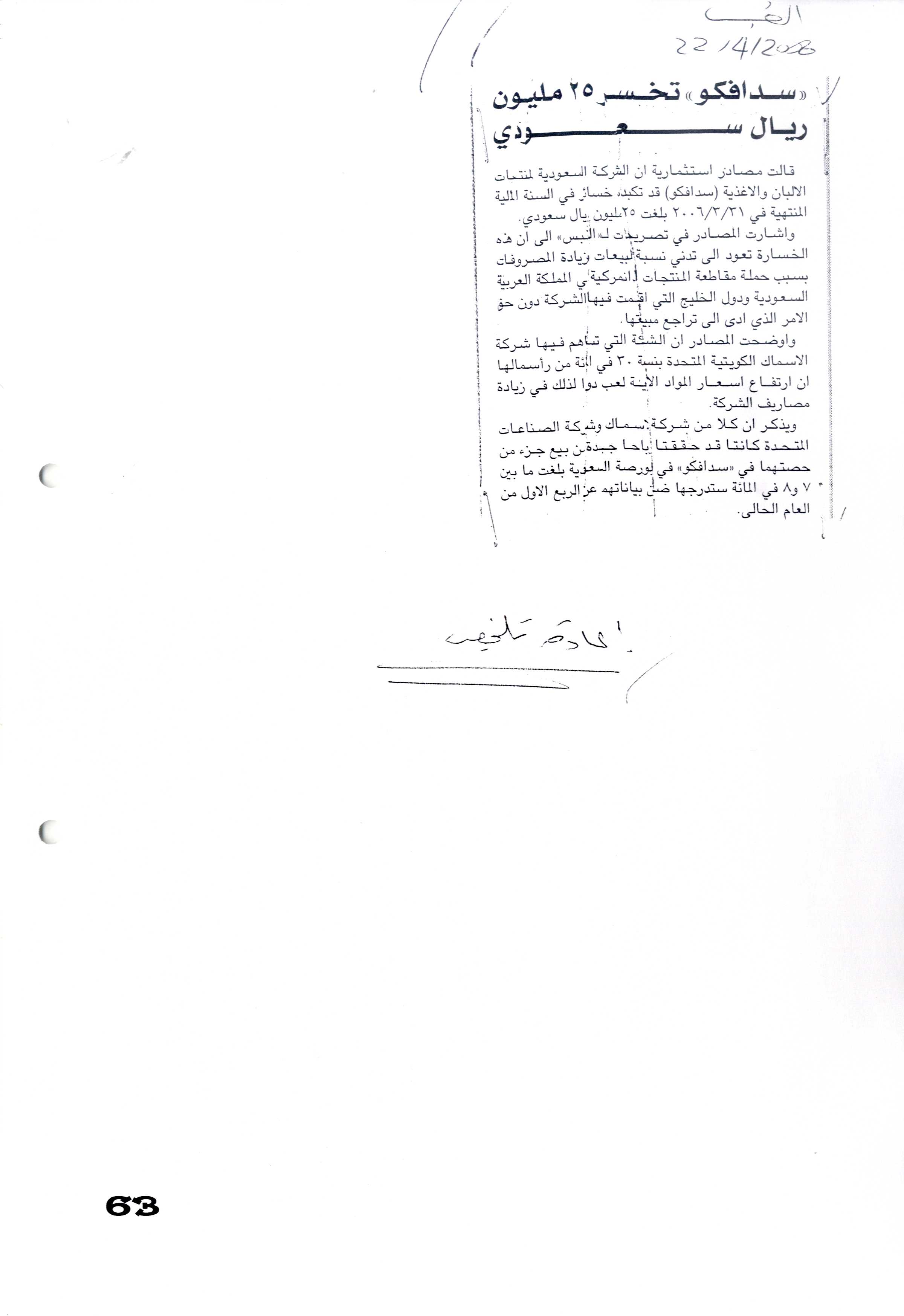 | 63 | القبس | 2006.04.22 | "سدافكو" تخسر 25 مليون ريال سعودي |