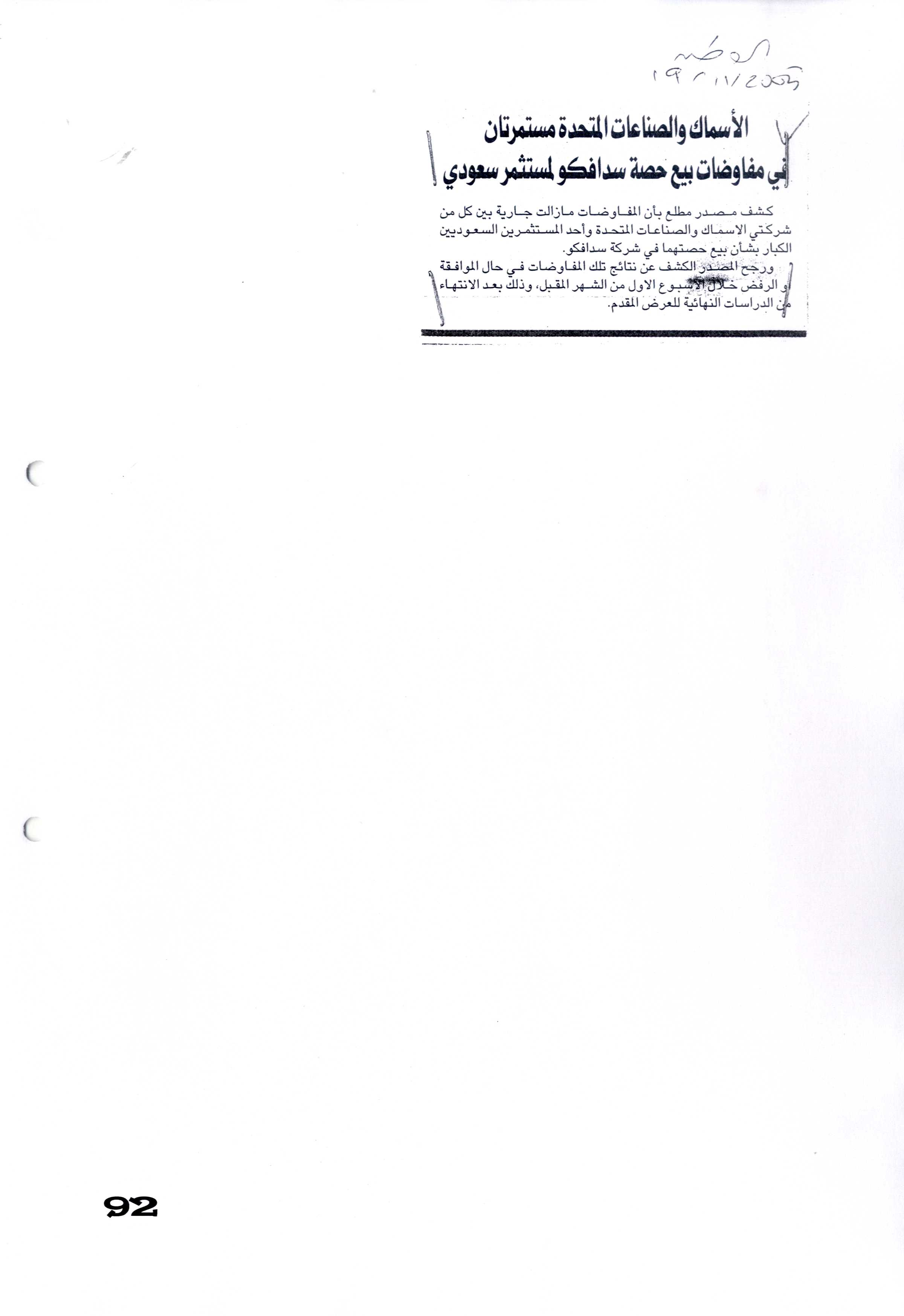 | 92 | الوطن | 2005.11.19 | الأسماك و "ص متحدة" مستمرتان في مفاوضات بيع حصة سدافكو لمستثمر سعودي |
