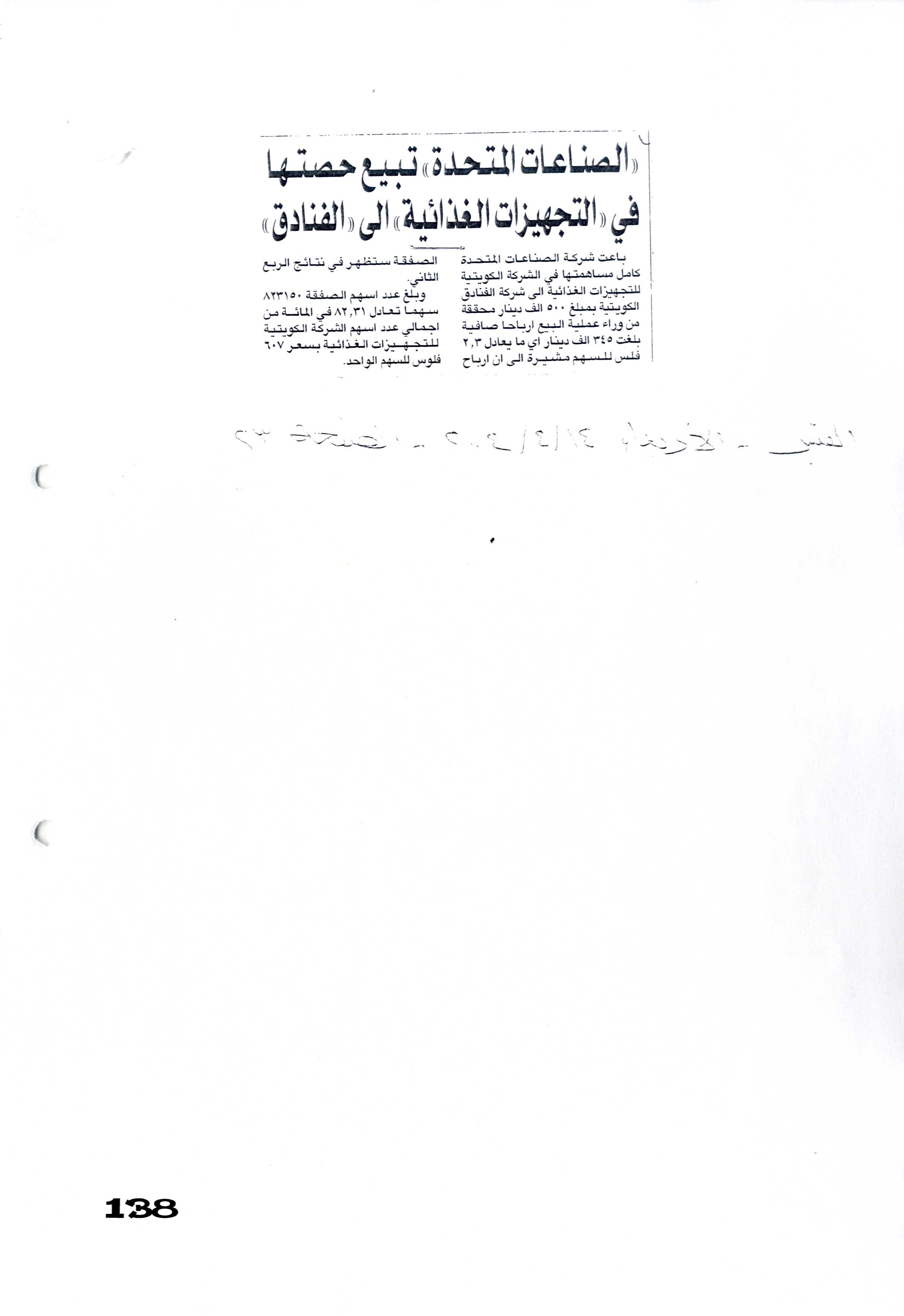 | 138 | القبس | 2004.04.14 | "ص متحدة" تبيع حصتها في "التجهيزات الغذائية" إلى "الفنادق" |