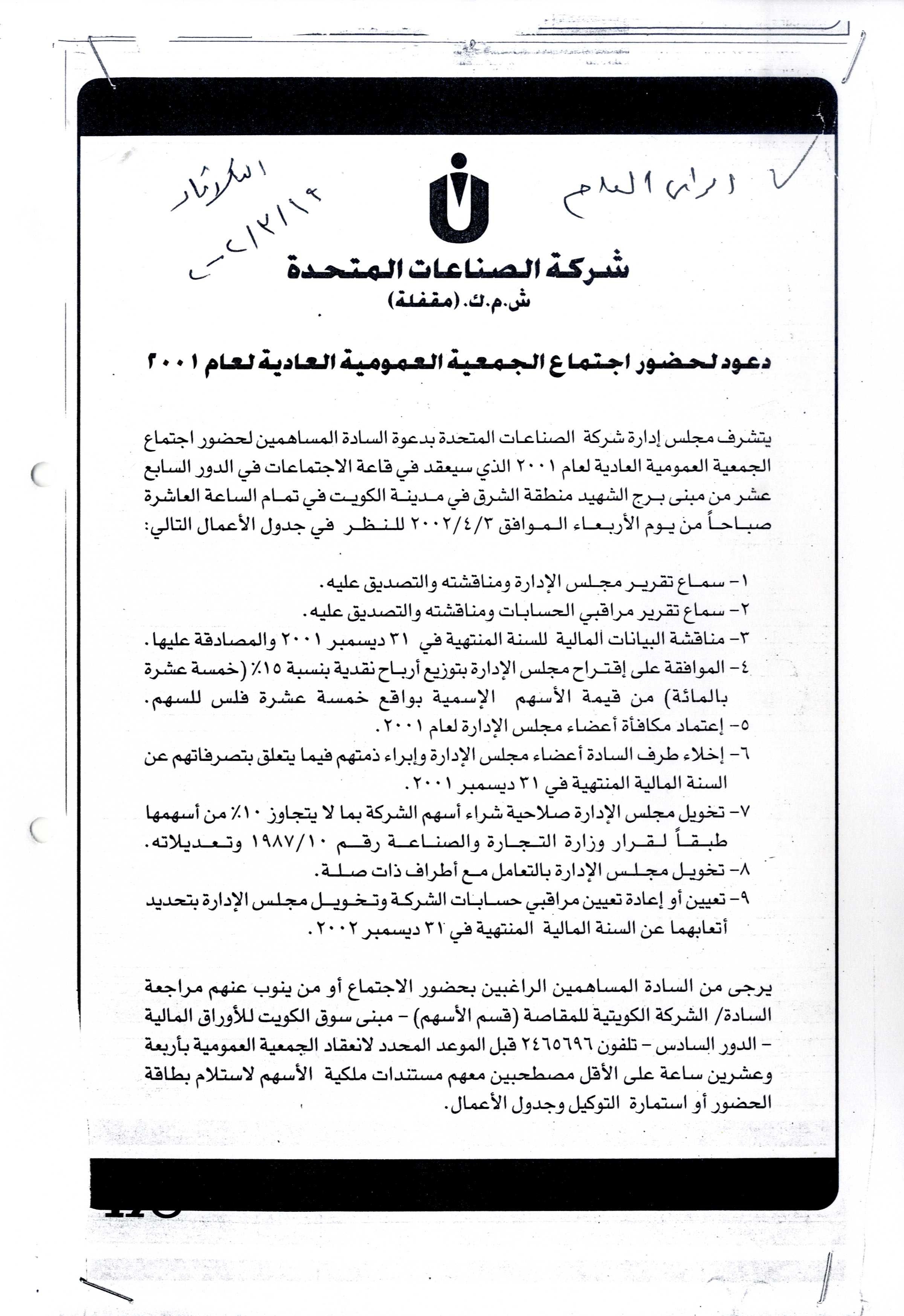 | 170 | الراي | 2002.03.19 | دعوة لحضور اجتماع الجمعية العمومية والعادية لعام 2001 و المقرر عقدها في 2002/4/3 |