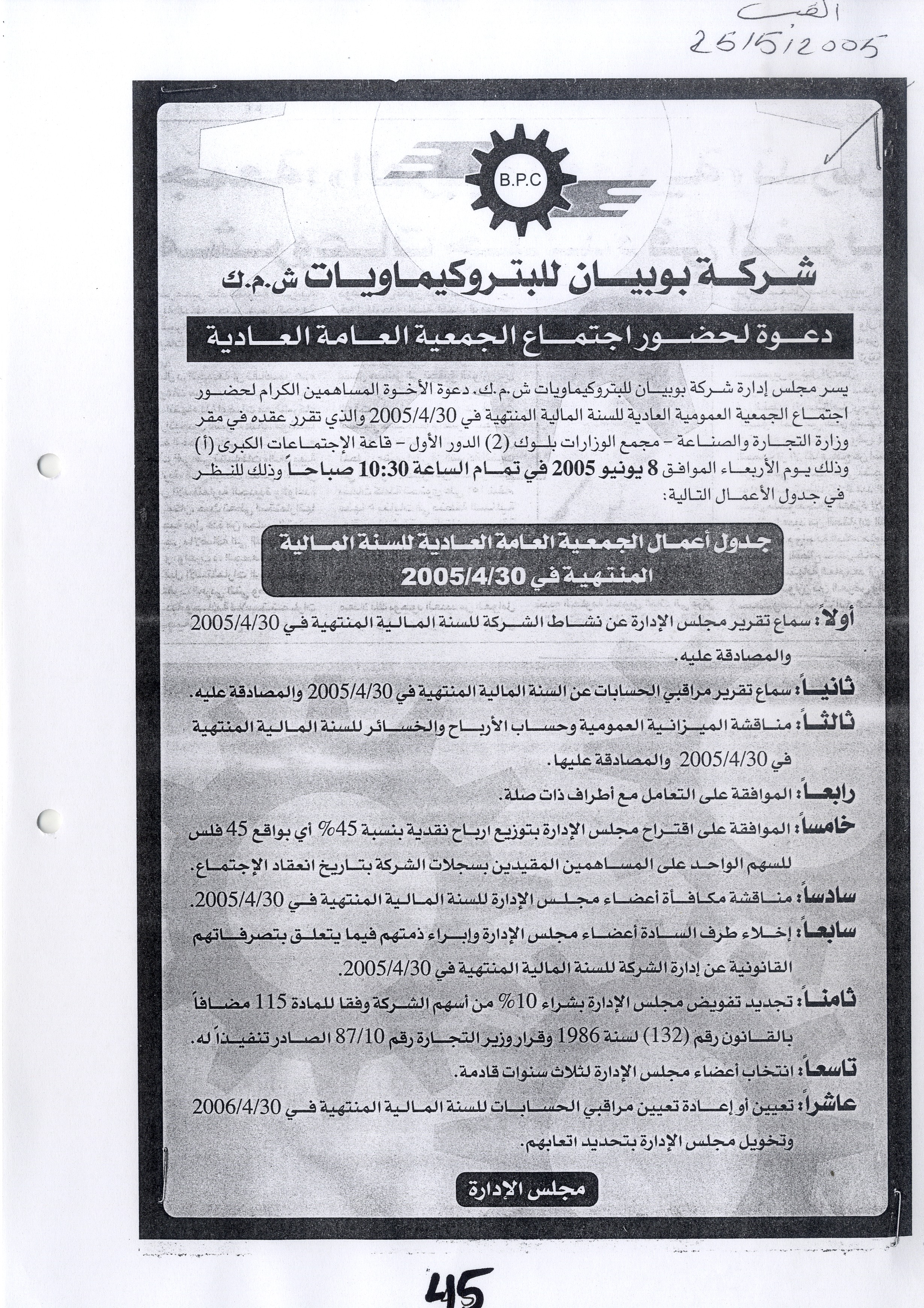 "بوبيان ب" : دعوة لحضور اجتماع الجمعية العامة العادية وغير العادية للسنة المالية المنتهية في 30 أبريل 2006
