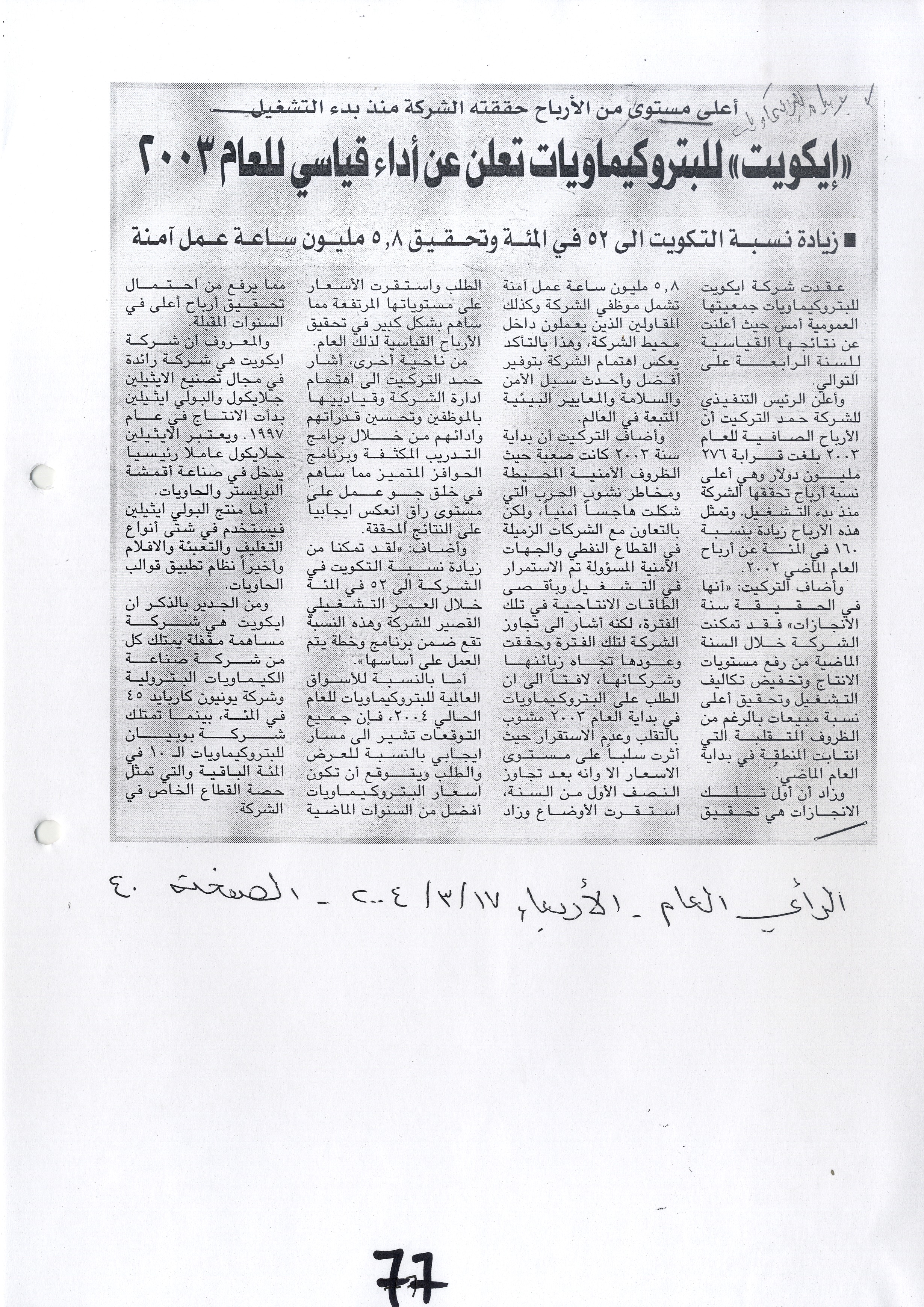 "إيكويت" للبتروكيماويات تعلن عن أداء قياسي للعام 2004