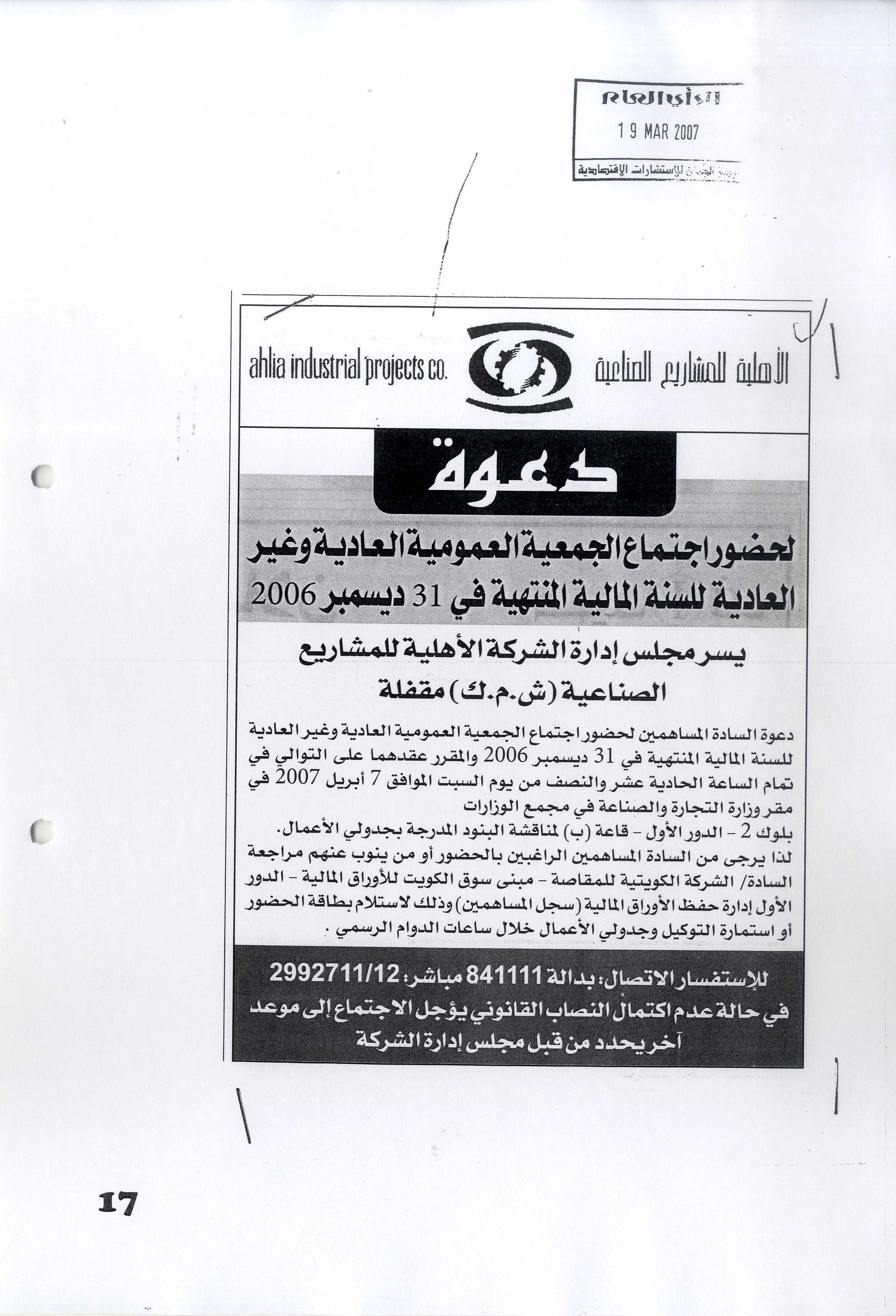 دعوة من "الكوت" لحضور الجمعية العمومية العادية وغير العادية للسنة المالية المنتهية في 2006/12/31 |