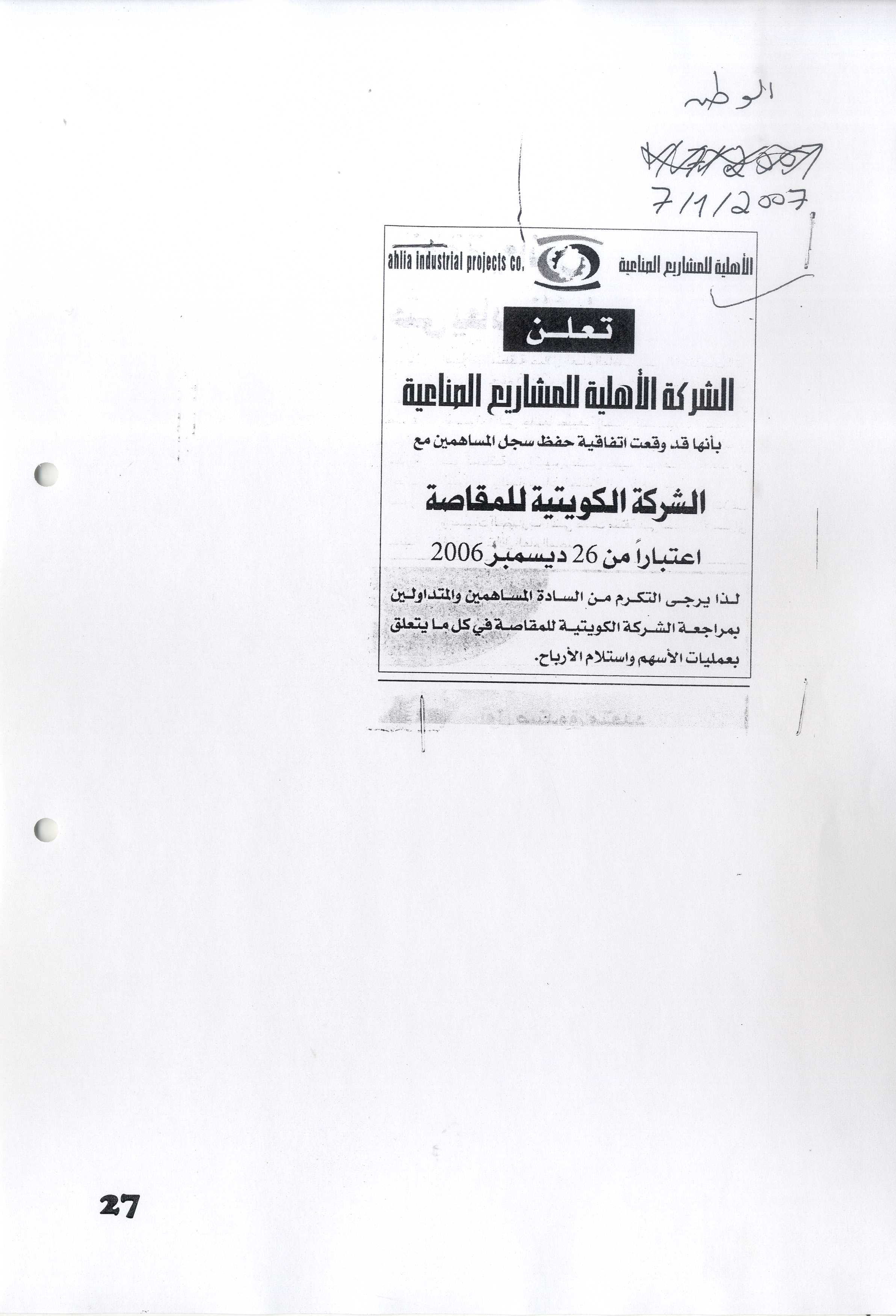 "الكوت" تعلن بأنها قد وقعت إتفاقية حفظ سجل المساهمين مع الشركة الكويتية للمقاصة اعتباراً من يوم 2006/12/26 |