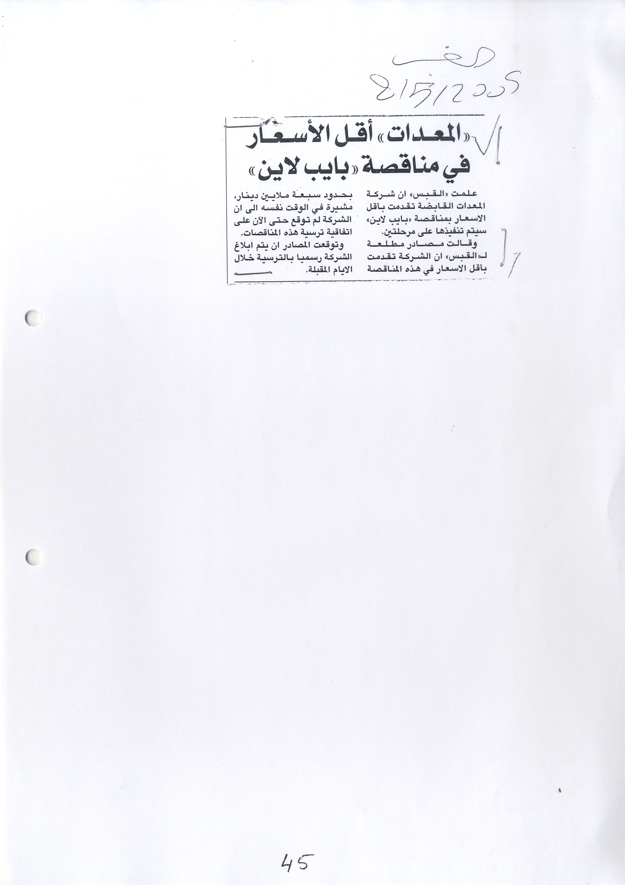 "المعدات" أقل الأسعار في مناقصة "بايب لاين" بحدود سبعة ملايين دينار