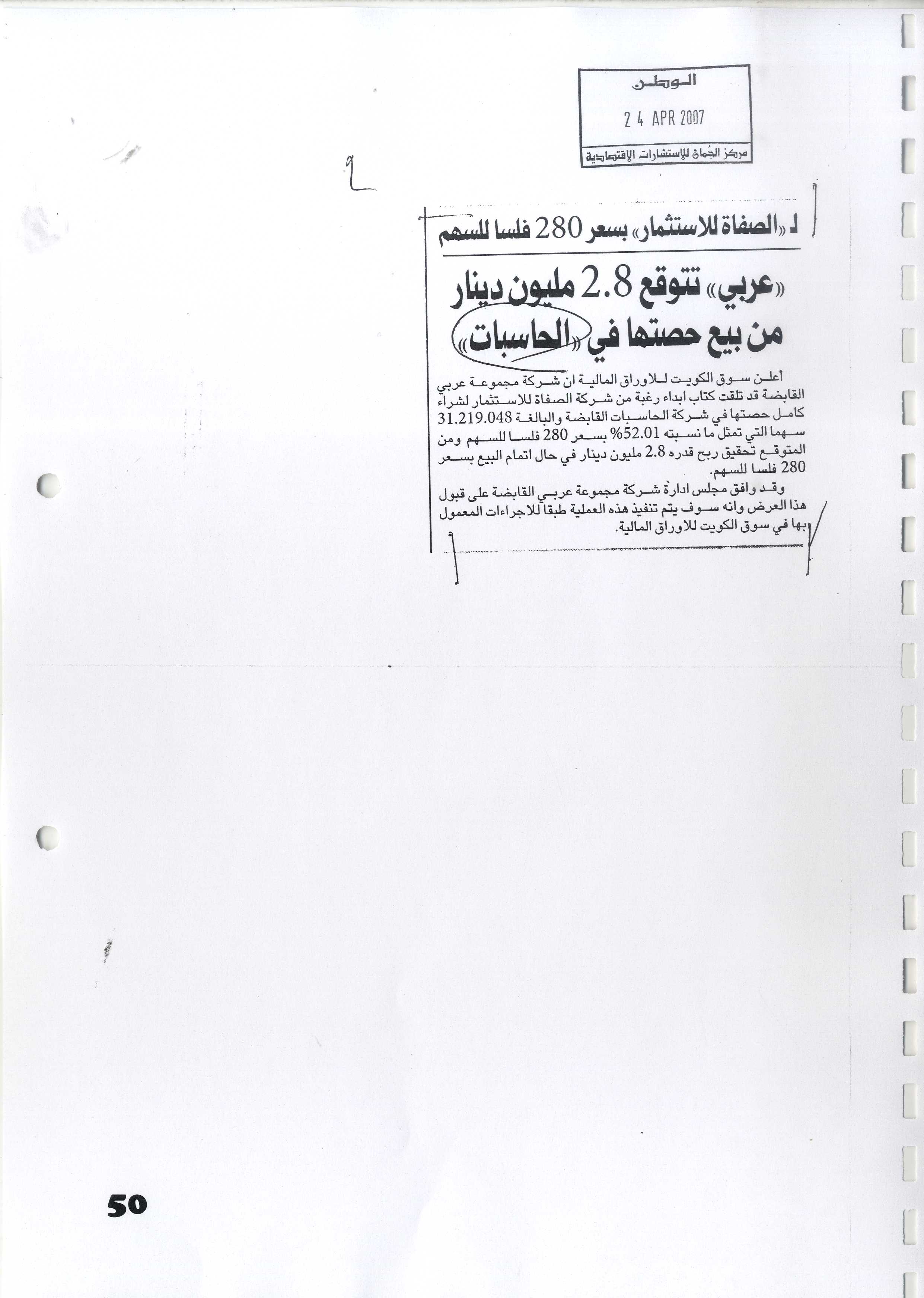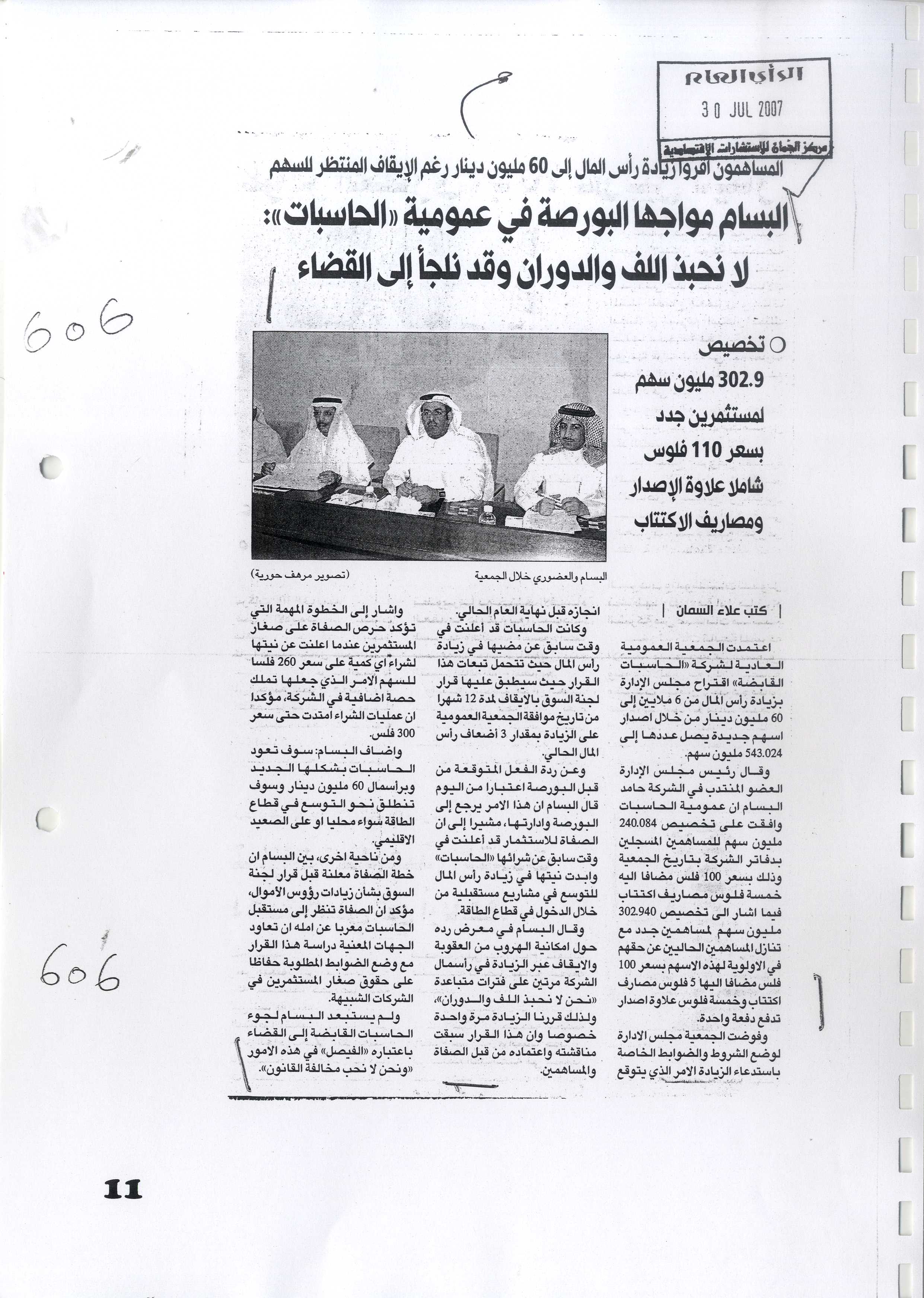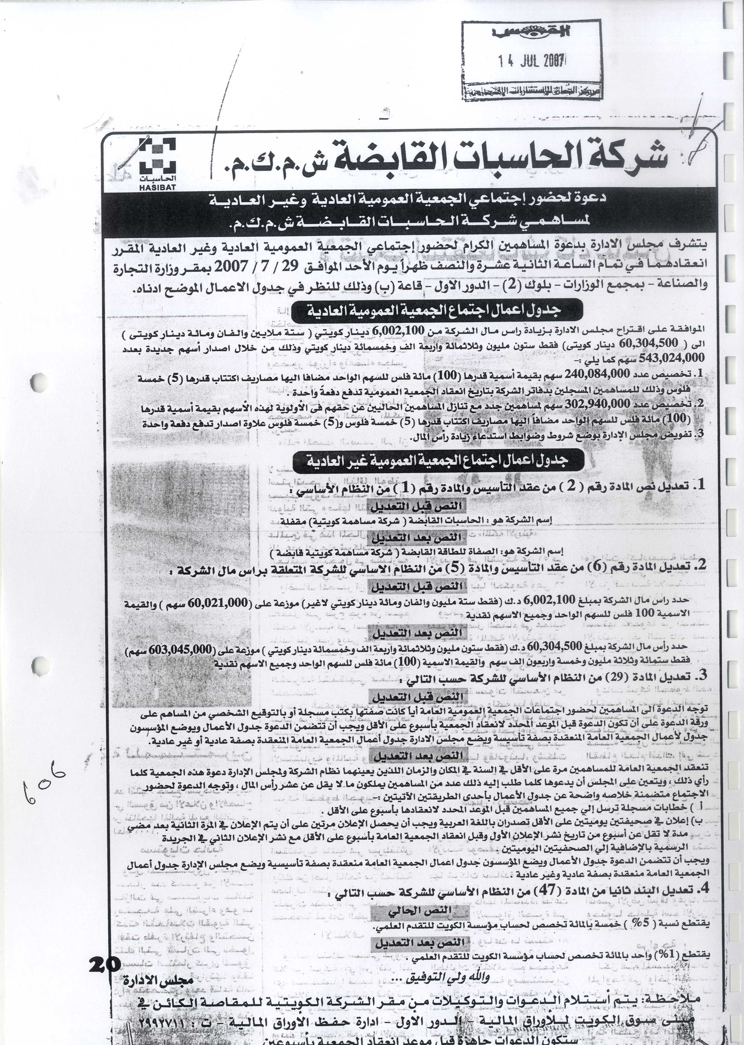 "الحاسبات" دعوة لحضور إجتماعي الجمعية العمومية العادية وغير العادية المقرر عقدها يوم 2007/7/29 |