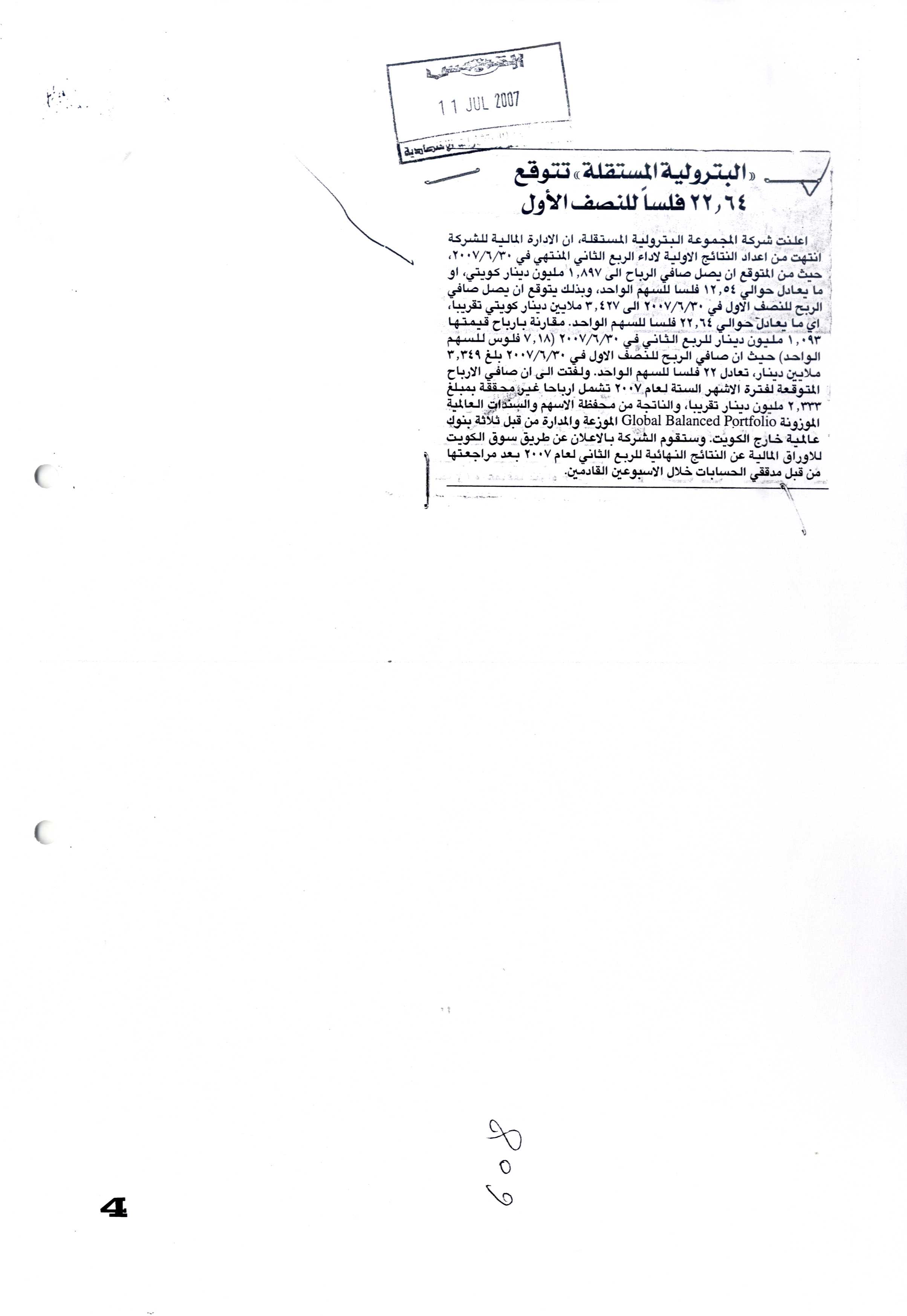 "بتروليـــة" : 30.2 فلساً ربحية السهم خلال الربع الثالث من 2007