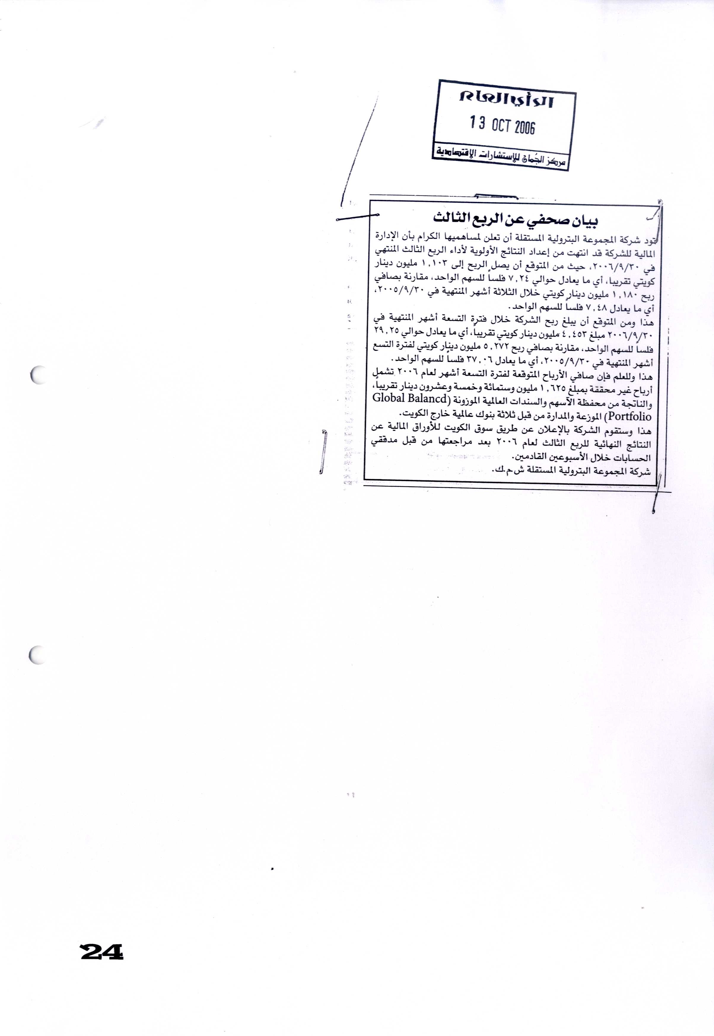"بتروليـــة" : ربحية السهم 29 فلساً في 9 أشهر المنتهية في 2006.09.30