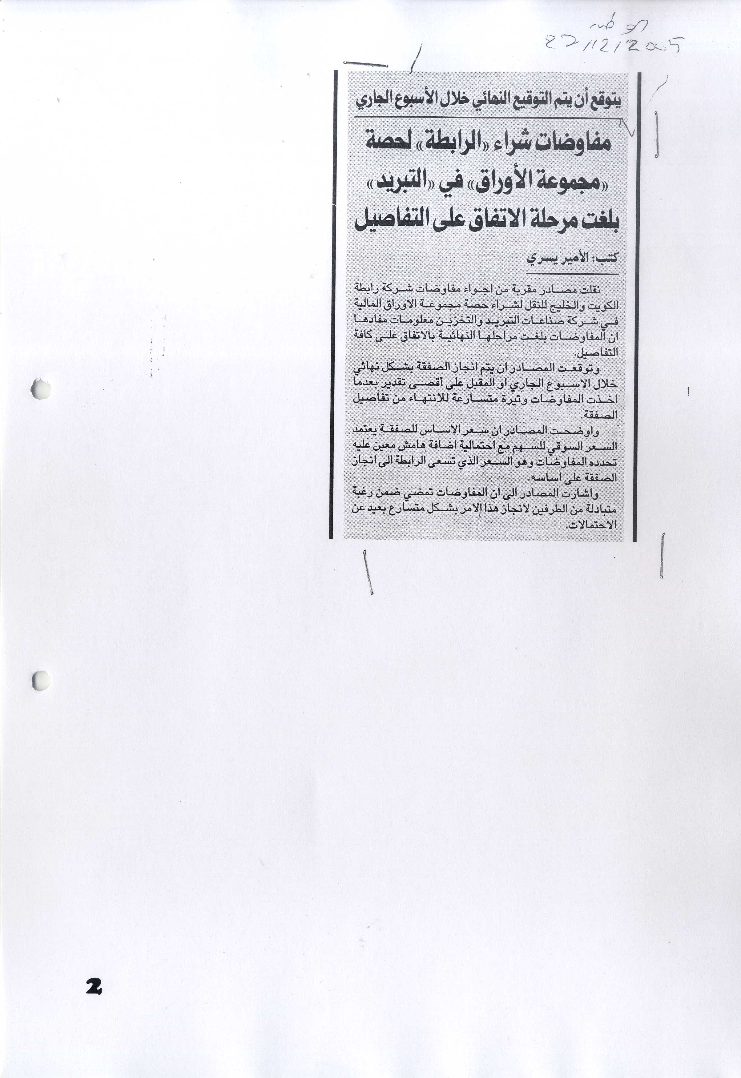 "الرابطة" تدرس شراء حصة في "التبريد" بسعر 700 فلس للسهم |