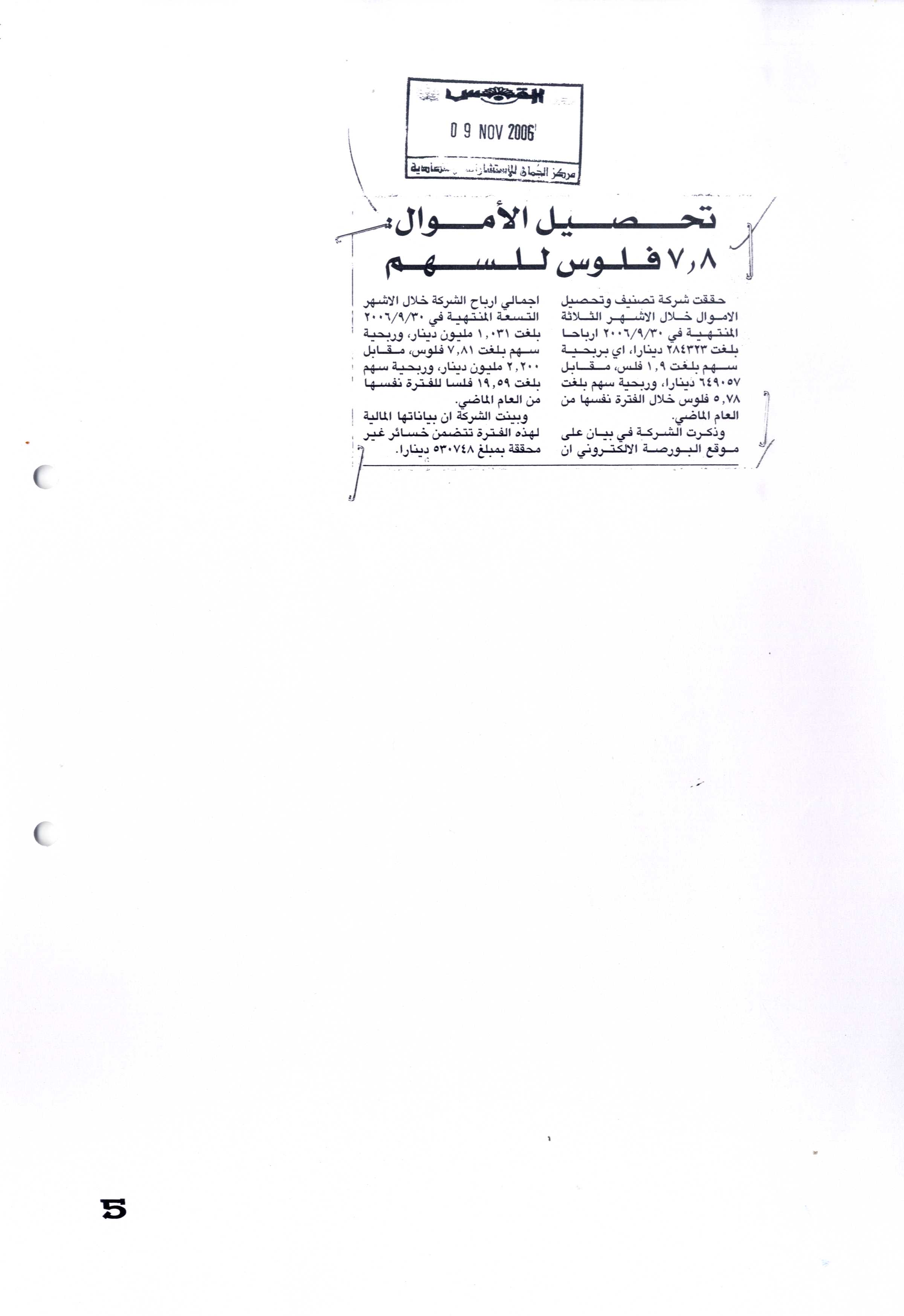 784 ألف دينار أرباح "تحصيـــــــلات" خلال الثلاثة أشهر المنتهية في 2006.09.30