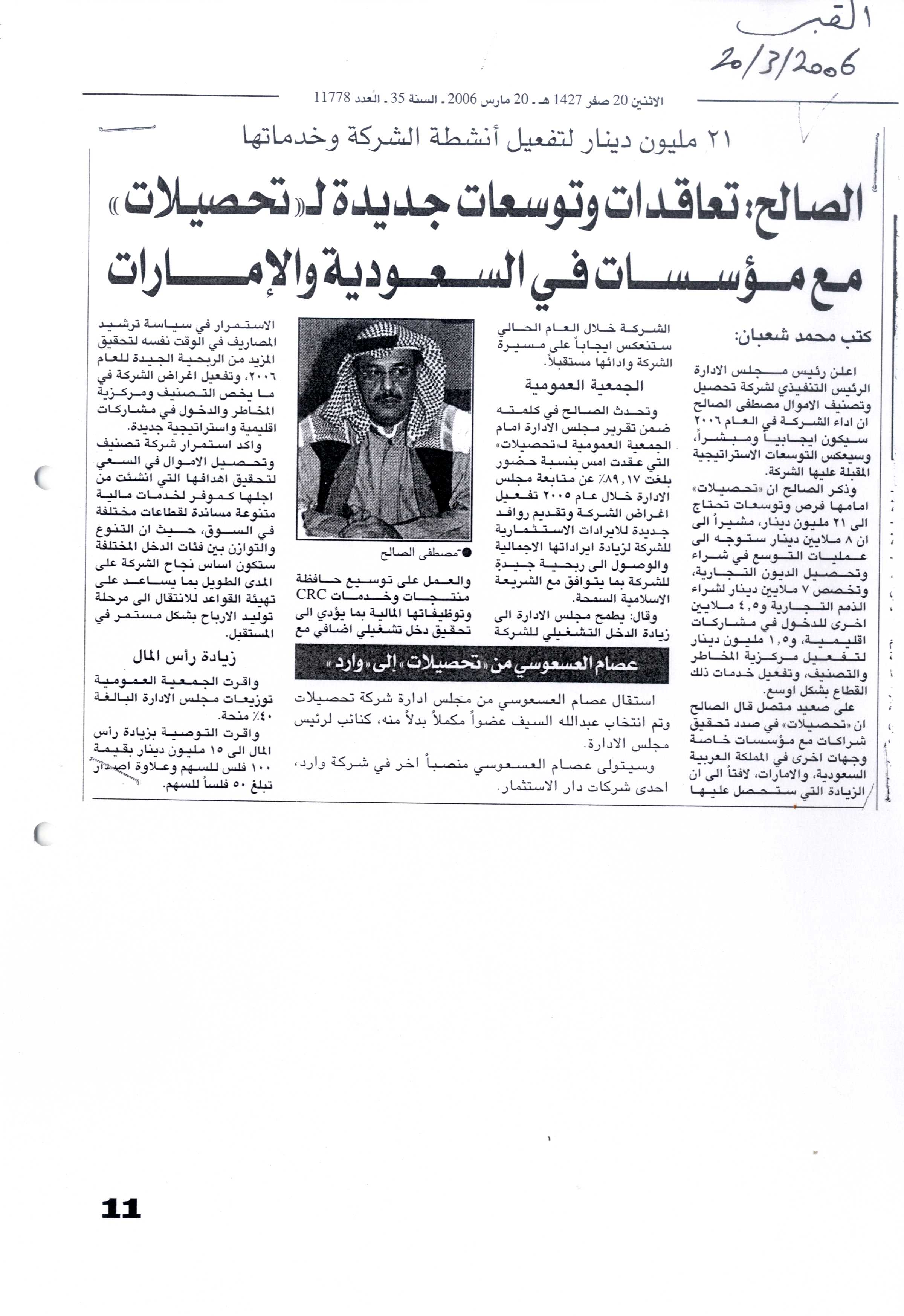 الصالح : إرتفاع أرباح "تحصيـــلات" بنسبة 264% خلال الأشهر الخمسة الأولى من عام 2005